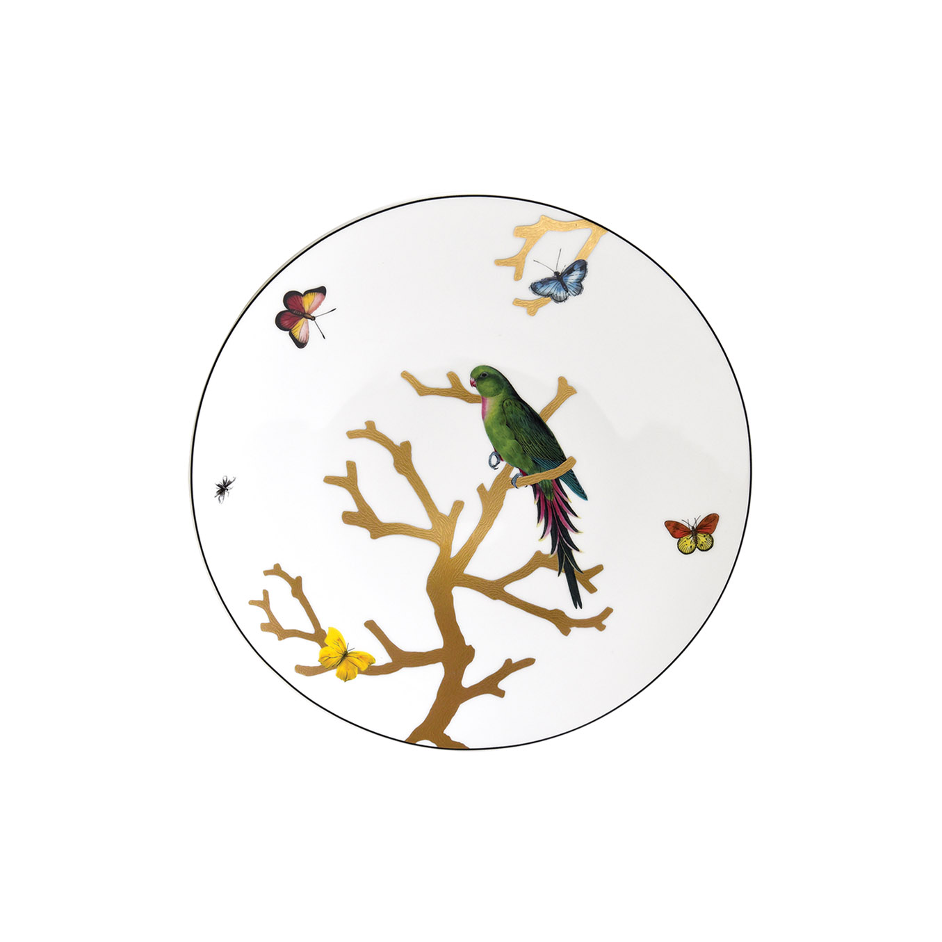 Dinner plate from Aux Oiseaux collection. Inspired by the curiosity cabinets that were so fashionable in the 16th and 17th centuries, the pattern is available on a full dinnerware service with scenes reminiscent of japanese prints: birds depicted in automnal colors perch on stylised trees in raised gold.