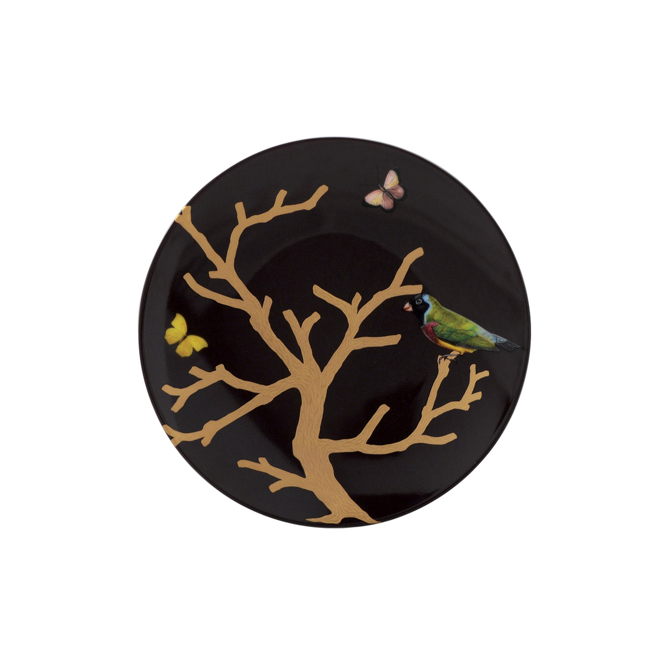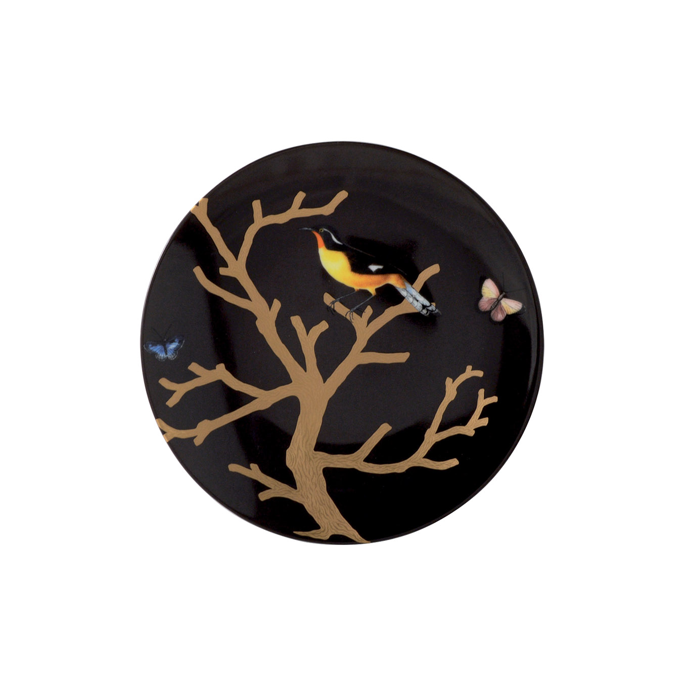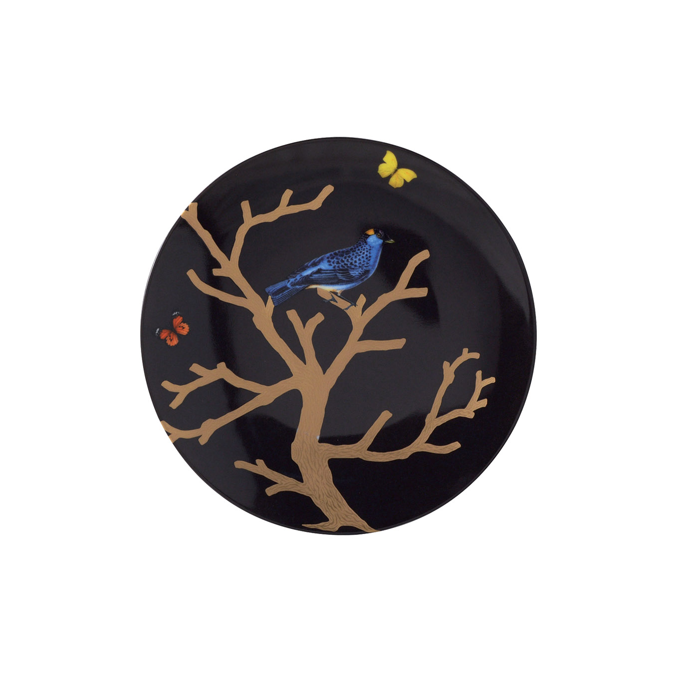 Gift box set of 4 Ebony salad plates from Aux Oiseaux collection. Inspired by the curiosity cabinets that were so fashionable in the 16th and 17th centuries, the pattern is available on a full dinnerware service with scenes reminiscent of japanese prints: birds depicted in automnal colors perch on stylised trees in raised gold.