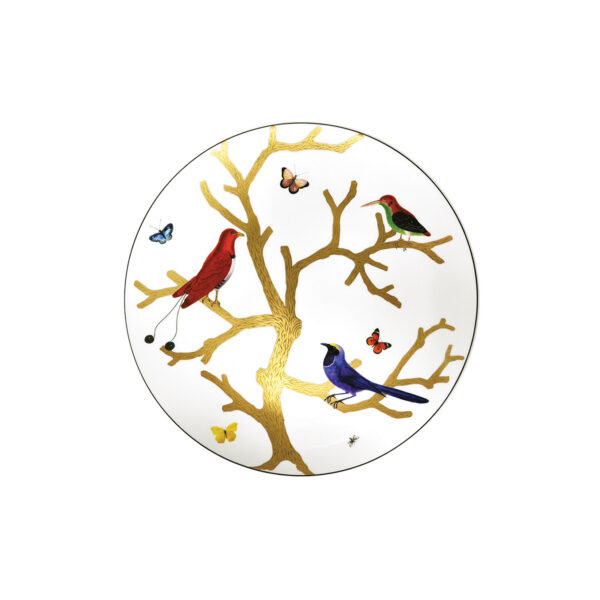 Ultra flat service plate from Aux Oiseaux collection. Inspired by the curiosity cabinets that were so fashionable in the 16th and 17th centuries, the pattern is available on a full dinnerware service with scenes reminiscent of japanese prints: birds depicted in automnal colors perch on stylised trees in raised gold.