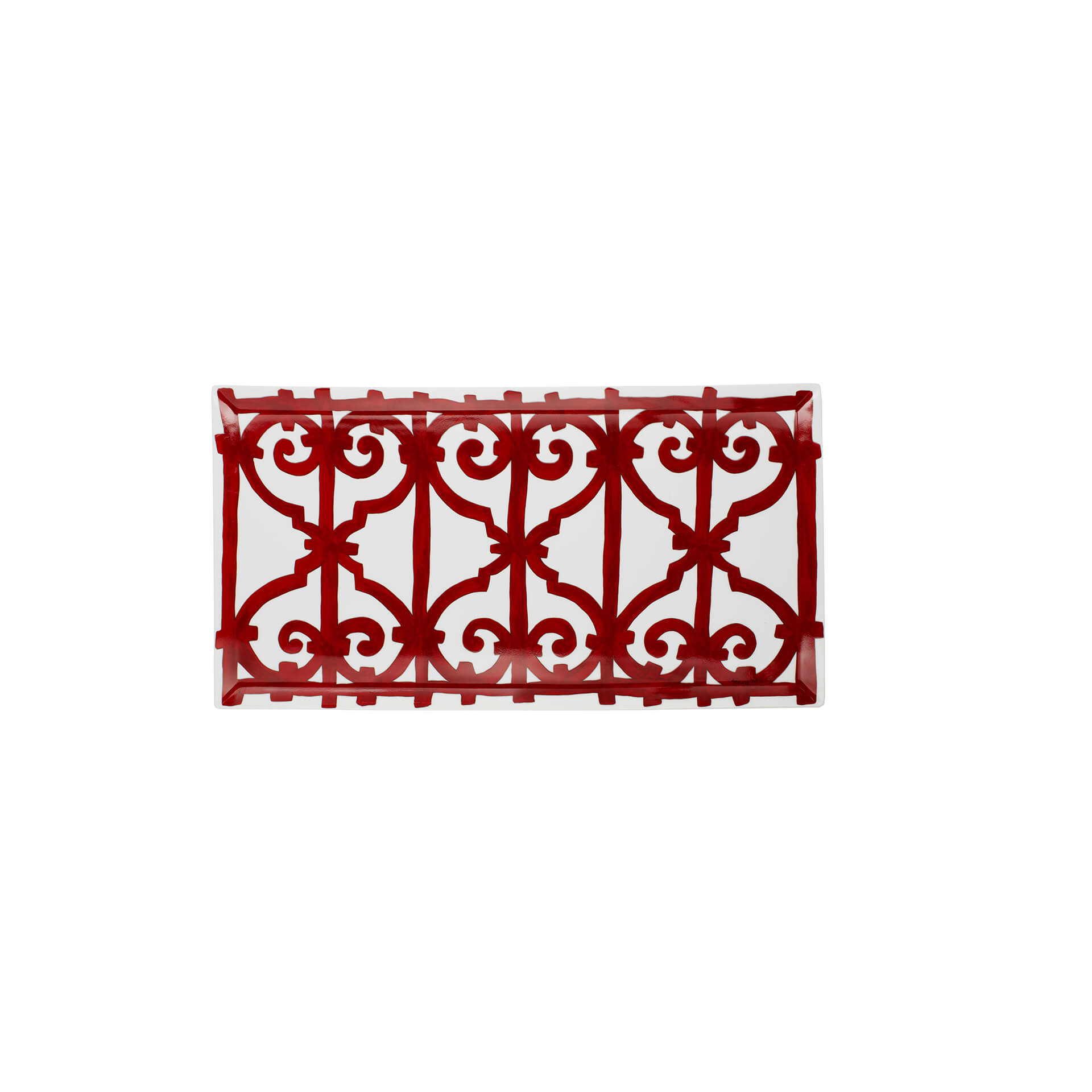 Rectangular platter from Balcon du Guadalquivir collection. The graphic, bold scenery recalls the ironwork of Andalusian towns. The sturdiness of the drawing, the vitality of the colour red, and the wealth and variety of the pieces make it a noble table service.