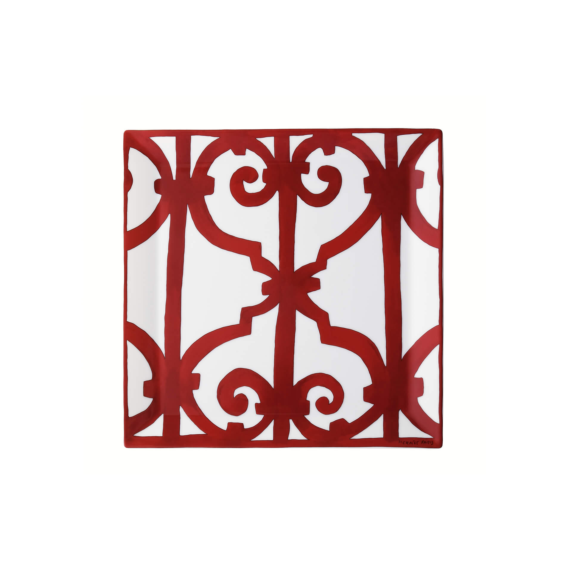 Square plate № 5 from Balcon du Guadalquivir collection. The graphic, bold scenery recalls the ironwork of Andalusian towns. The sturdiness of the drawing, the vitality of the colour red, and the wealth and variety of the pieces make it a noble table service.