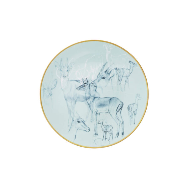 Dessert plate Impalas from Carnets d’Équateur collection. Jaguars, macaws, panthers and impalas frolic through lush natural settings under the watchful eye of naturalist and painter Robert Dallet. This porcelain collection breathes new life into the full range of the artist’s work, from spontaneous sketches to hyperrealist gouache paintings.