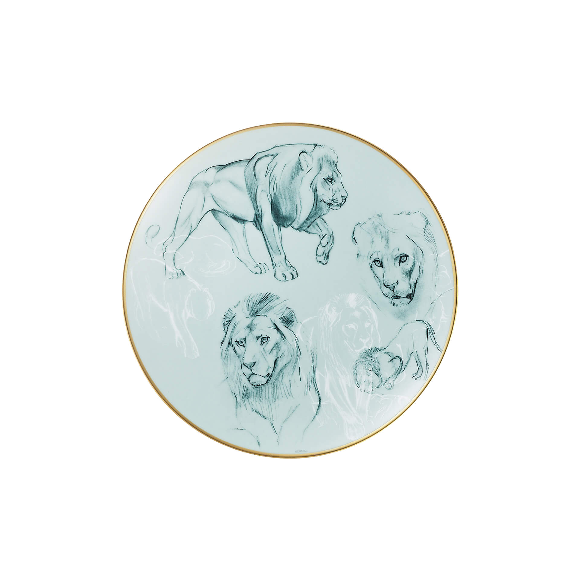 Dessert plate Lions from Carnets d’Équateur collection. Jaguars, macaws, panthers and impalas frolic through lush natural settings under the watchful eye of naturalist and painter Robert Dallet. This porcelain collection breathes new life into the full range of the artist’s work, from spontaneous sketches to hyperrealist gouache paintings.