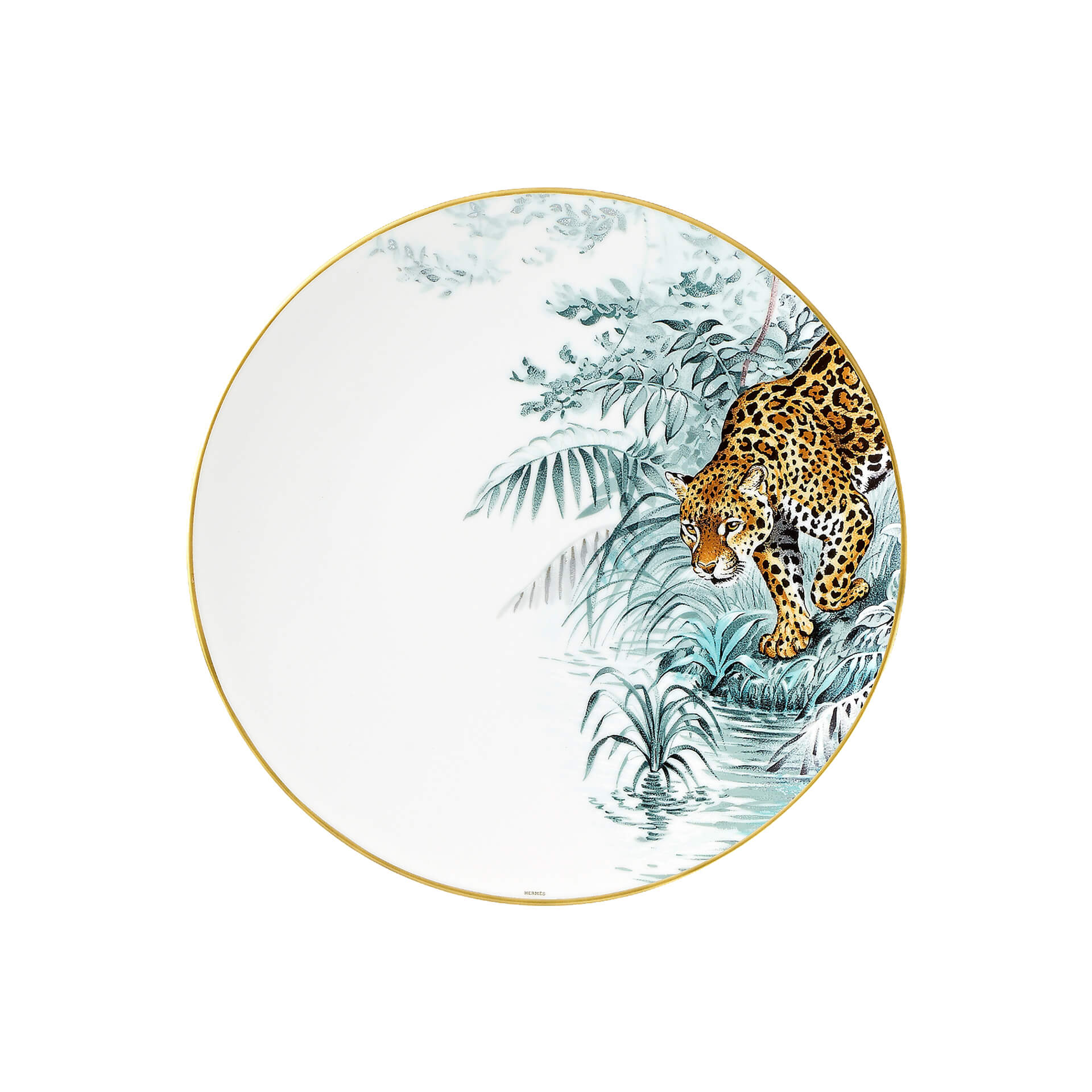 Dinner plate Jaguar from Carnets d’Équateur collection. Jaguars, macaws, panthers and impalas frolic through lush natural settings under the watchful eye of naturalist and painter Robert Dallet. This porcelain collection breathes new life into the full range of the artist’s work, from spontaneous sketches to hyperrealist gouache paintings.