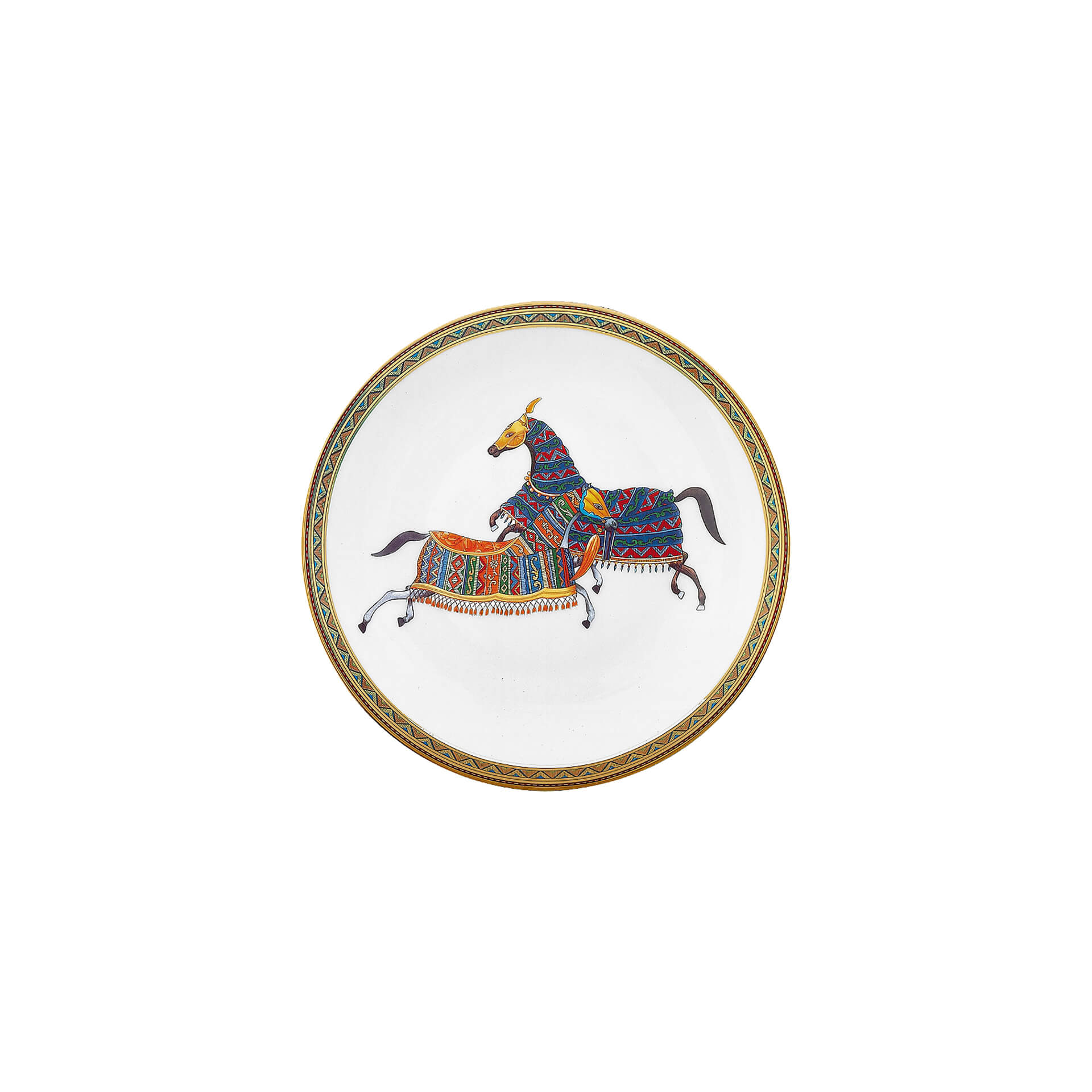 Bread and butter plate № 1 from Cheval d’Orient collection. Joyful horses enjoy their freedom, galloping across the steppe and climbing wooded hills. Resplendent in their gleaming, brightly coloured caparisons, they seem to have only just escaped from a Persian legend. The accompanying floral and multicolour stripe patterns dotted with gold evoke the Silk Road and Eastern hospitality.