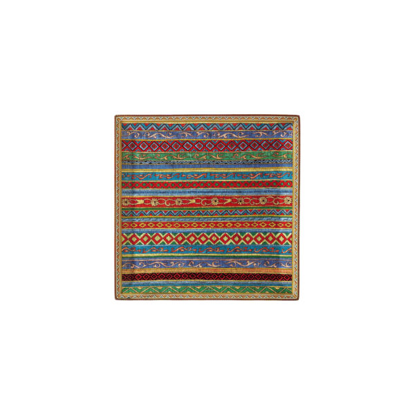 Square plate № 5 from Cheval d’Orient collection. Joyful horses enjoy their freedom, galloping across the steppe and climbing wooded hills. Resplendent in their gleaming, brightly coloured caparisons, they seem to have only just escaped from a Persian legend. The accompanying floral and multicolour stripe patterns dotted with gold evoke the Silk Road and Eastern hospitality.