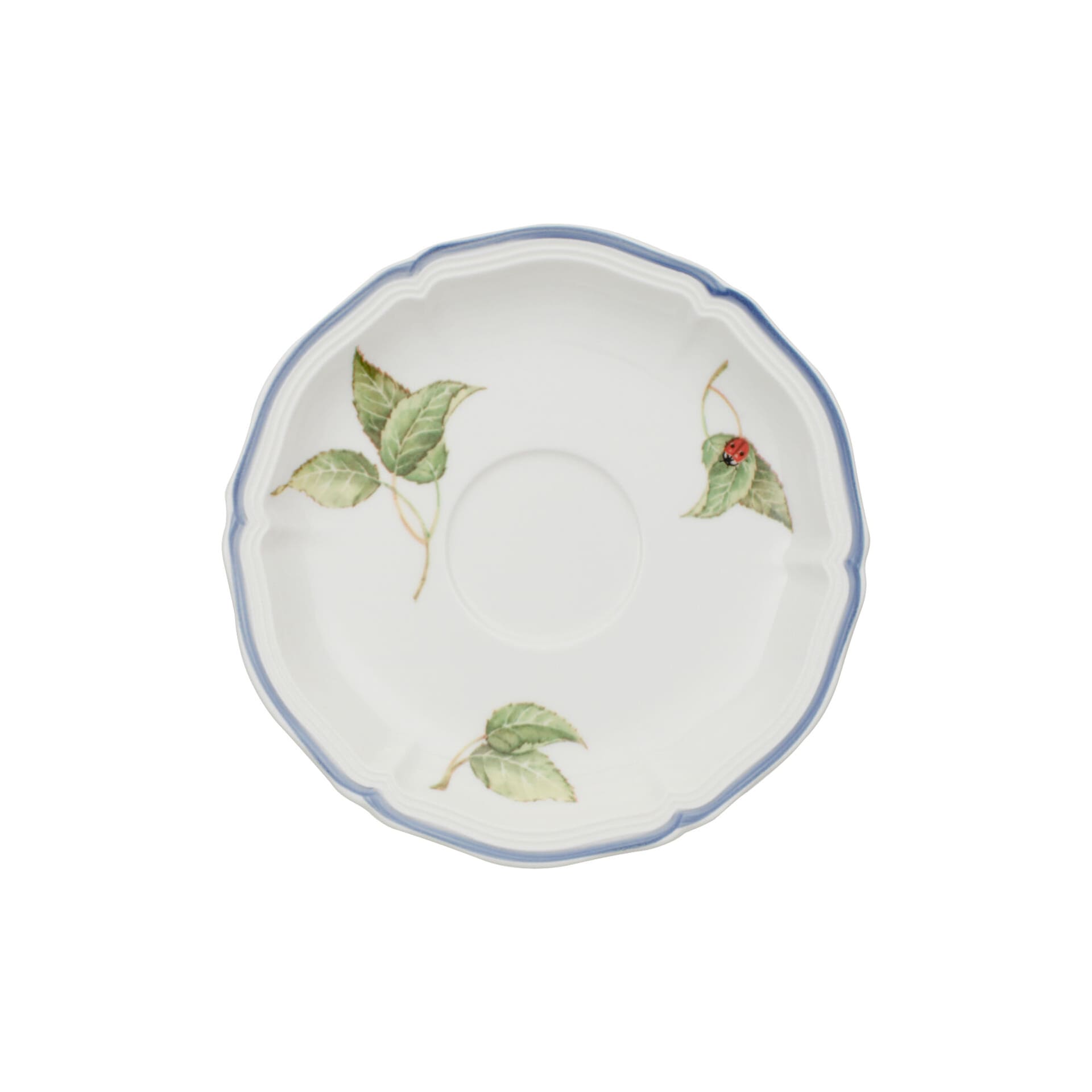 This saucer coffee cup forms part of Villeroy Bochs Cottage collection which brings idyllic country life into every kitchen or dining room. The appeal of the Cottage decor is in the unique details. Scalloped edges, a relief trim and hand painted accents make this premium porcelain tableware a treasure to own, one that you will appreciate every morning. It is both microwave and dishwasher safe.