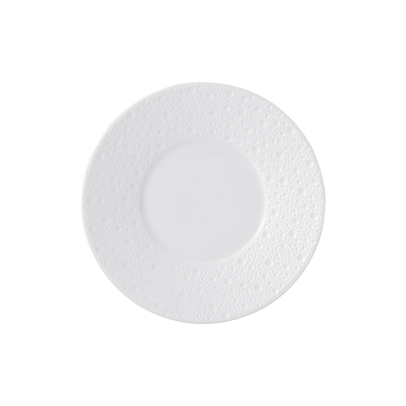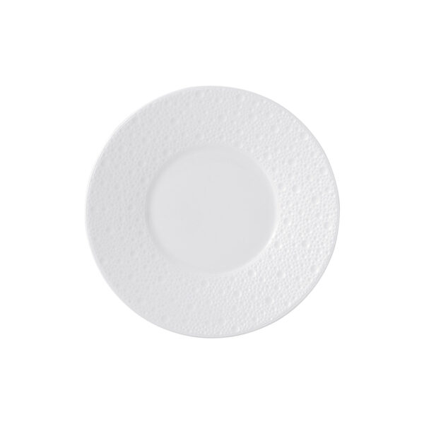 Plate from Écume White collection. Subtle effects within the material, masterful glazing work, the hollow engraving of Écume makes for a contemporary and poetic collection that produces a highly elegant and modern table setting.
