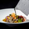Plate from Écume White collection. Subtle effects within the material, masterful glazing work, the hollow engraving of Écume makes for a contemporary and poetic collection that produces a highly elegant and modern table setting.