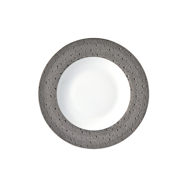 Large rim soup plate from Écume Platine collection. Subtle effects within the material, masterful glazing work, the hollow engraving of Écume makes for a contemporary and poetic collection that produces a highly elegant and modern table setting.