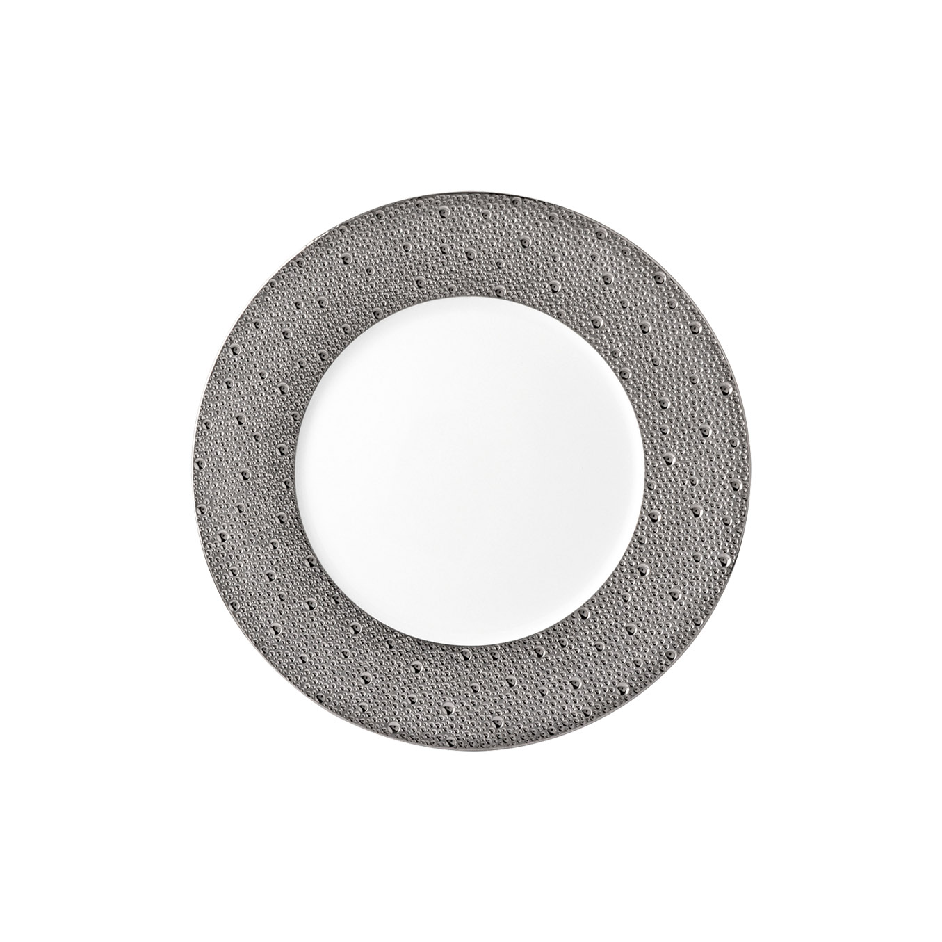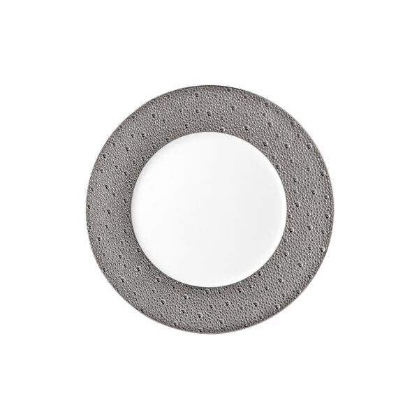 Service plate from Écume Platine collection. Subtle effects within the material, masterful glazing work, the hollow engraving of Écume makes for a contemporary and poetic collection that produces a highly elegant and modern table setting.