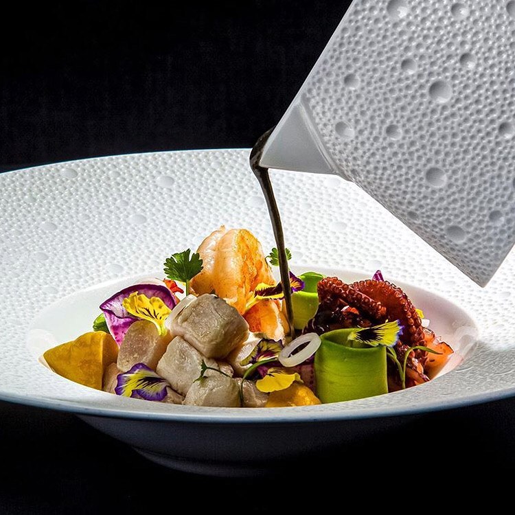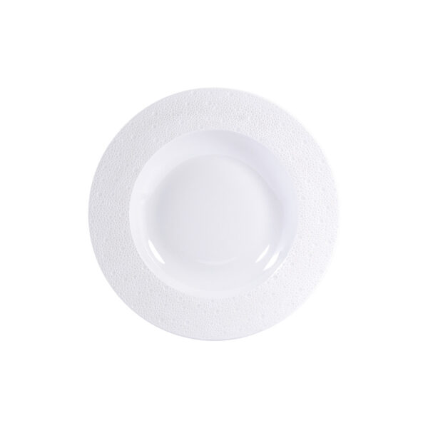 Small rim soup plate from Écume White collection. Subtle effects within the material, masterful glazing work, the hollow engraving of Écume makes for a contemporary and poetic collection that produces a highly elegant and modern table setting.