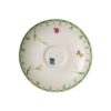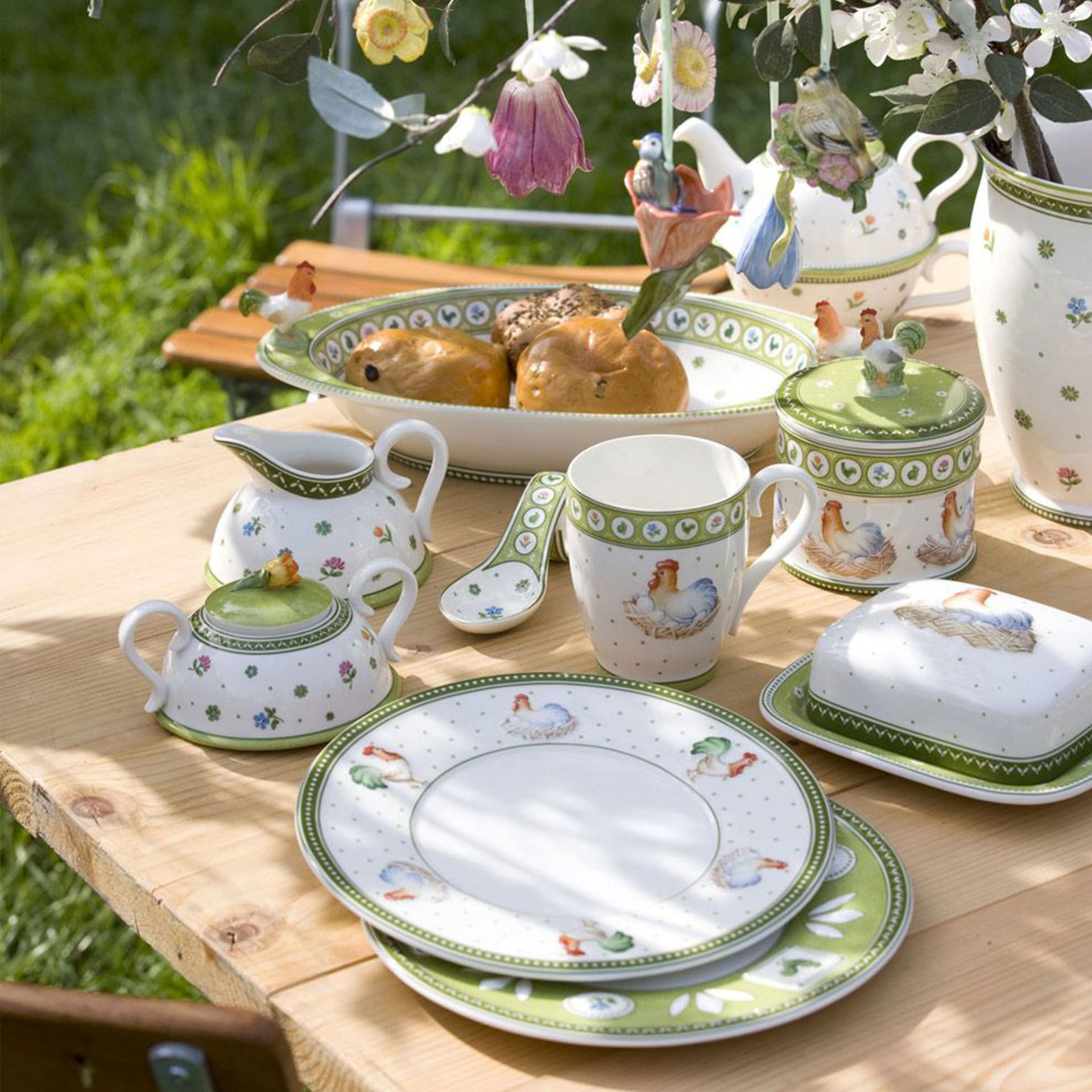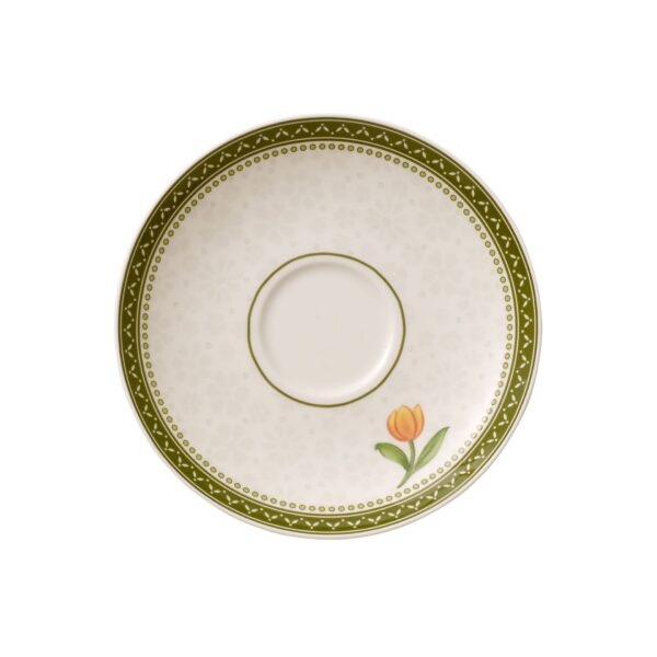 Farmers Spring saucer coffee cup. The Farmers Spring collection was designed to enrich your table during Easter, but is ideal for use all year long. The motifs are taken from an awakening Spring coming out of the shadow of winter, with white and green as the dominate colors in this collection that features rabbits, chickens, and blooming plants. The entire collection creates a very romantic connection that introduces a joyful atmosphere to your table setting.