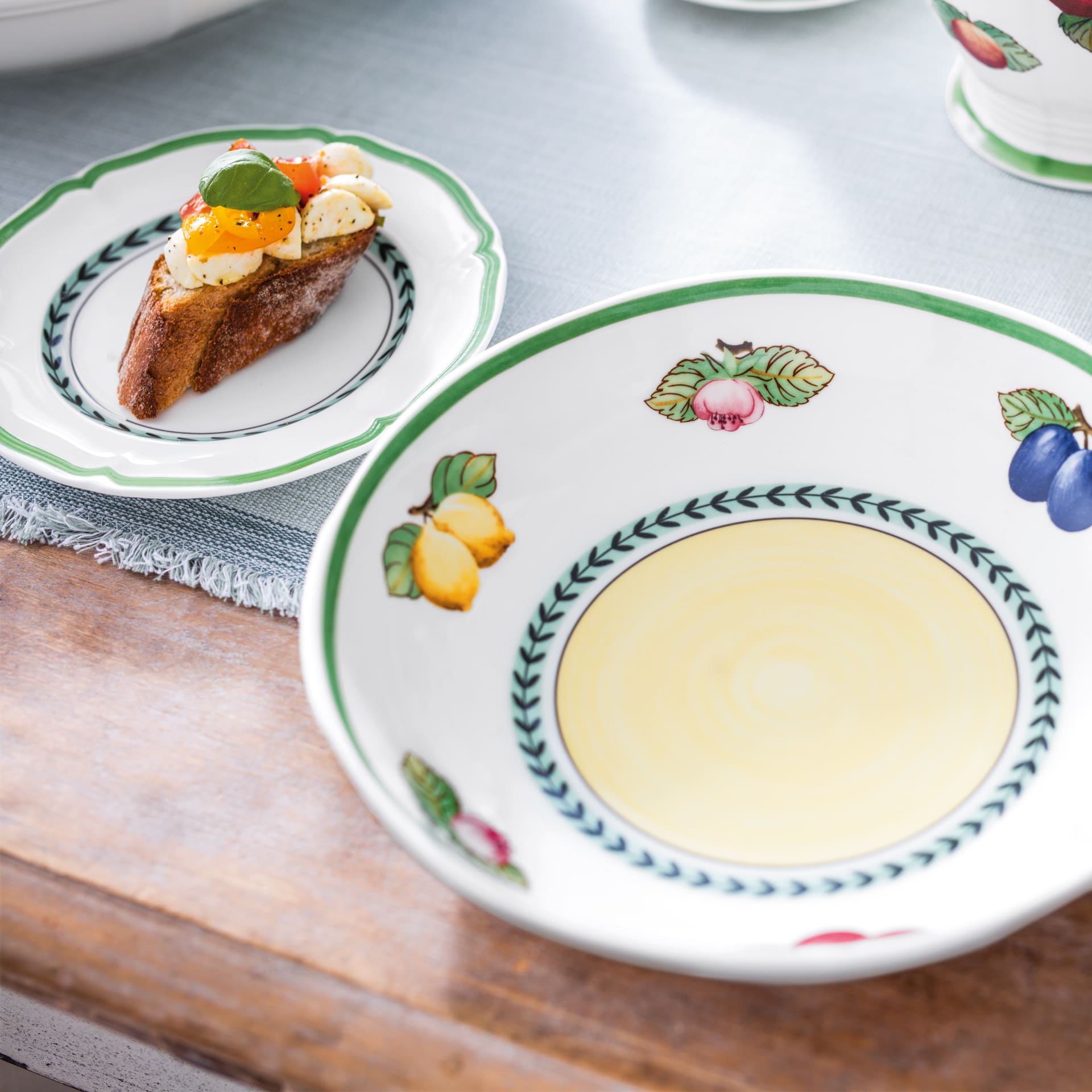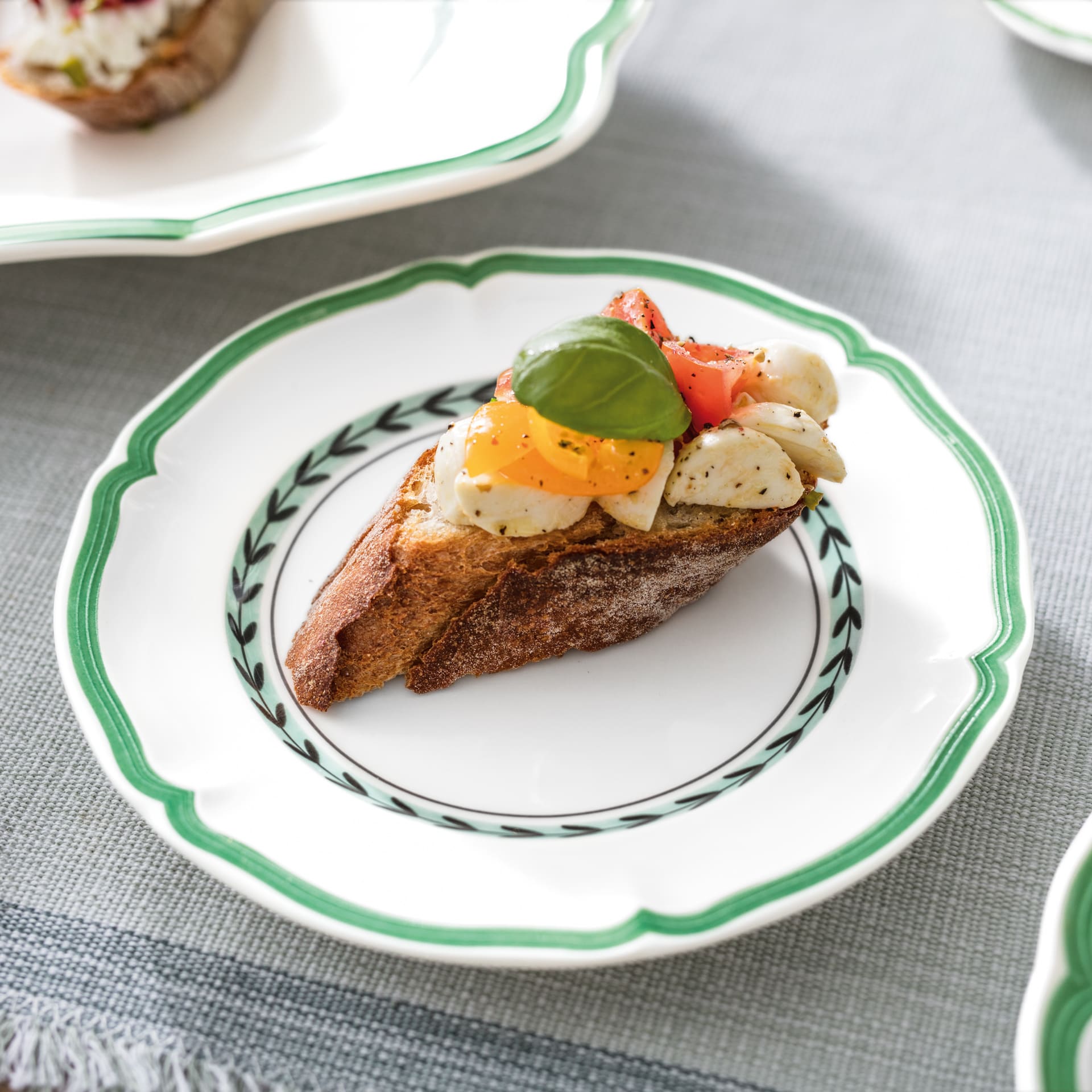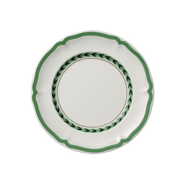 Bread plate for small side dishes. French Garden has always stood for summer freshness and French joie de vivre. The Green Line version gives the cosy country house style a modern touch. Whether you prefer a strong farmhouse bread, original Italian ciabatta or oven-warm baguette: fresh bread is simply a part of any meal. Best served on the small plate matching the French Garden Green Line tableware service. Discover French country house style with a fresh look.