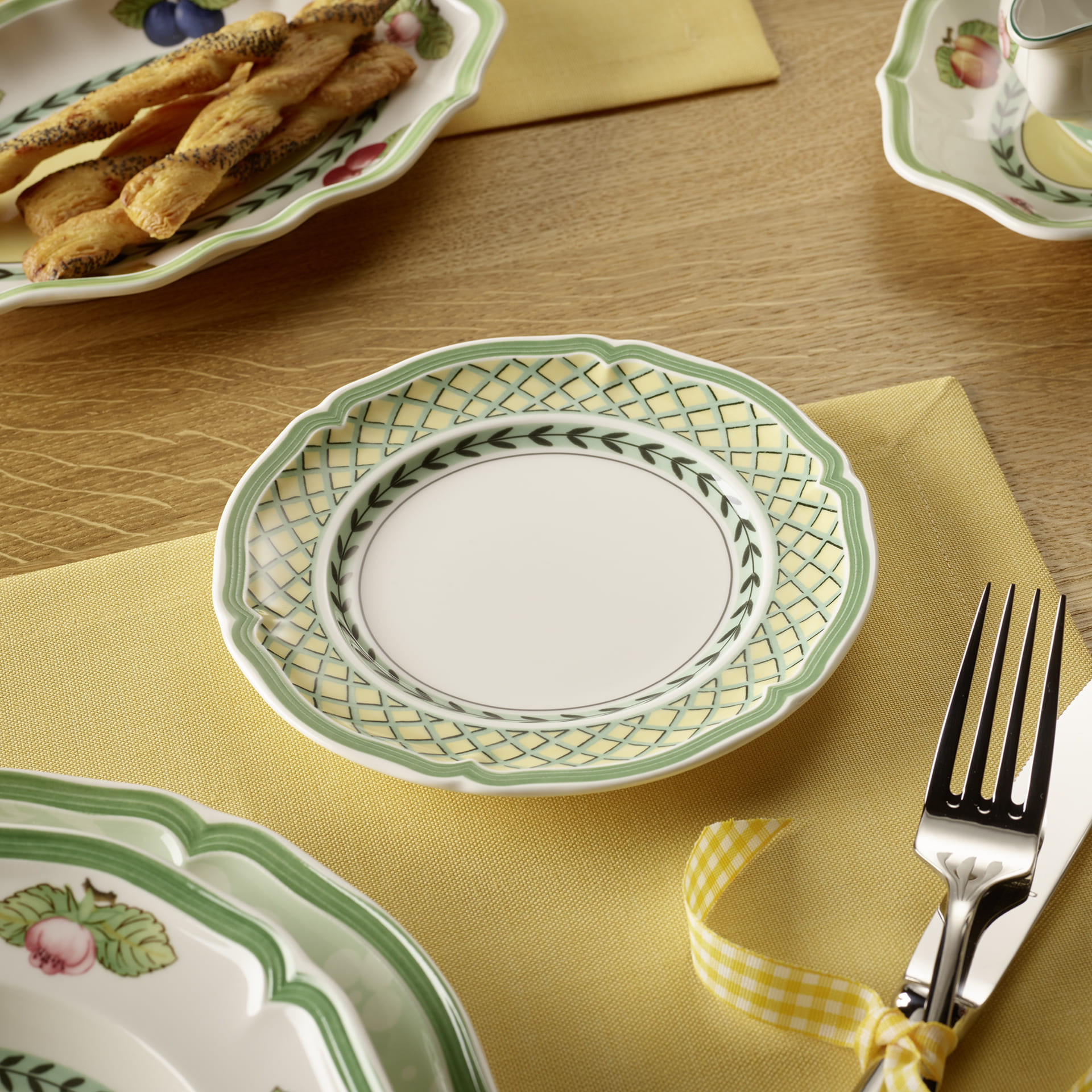 Bread plate for small side dishes. French Garden creates a magnificent orchard on the table with traditional country house elements in warm colours. Its timeless beauty allows the different summer decors to be mixed and matched with each other. Whether you prefer a strong farmhouse bread, original Italian ciabatta or oven-warm baguette: fresh bread is simply a part of any meal. Best served on the small plate matching the tableware. Impress your guests with beautiful details.