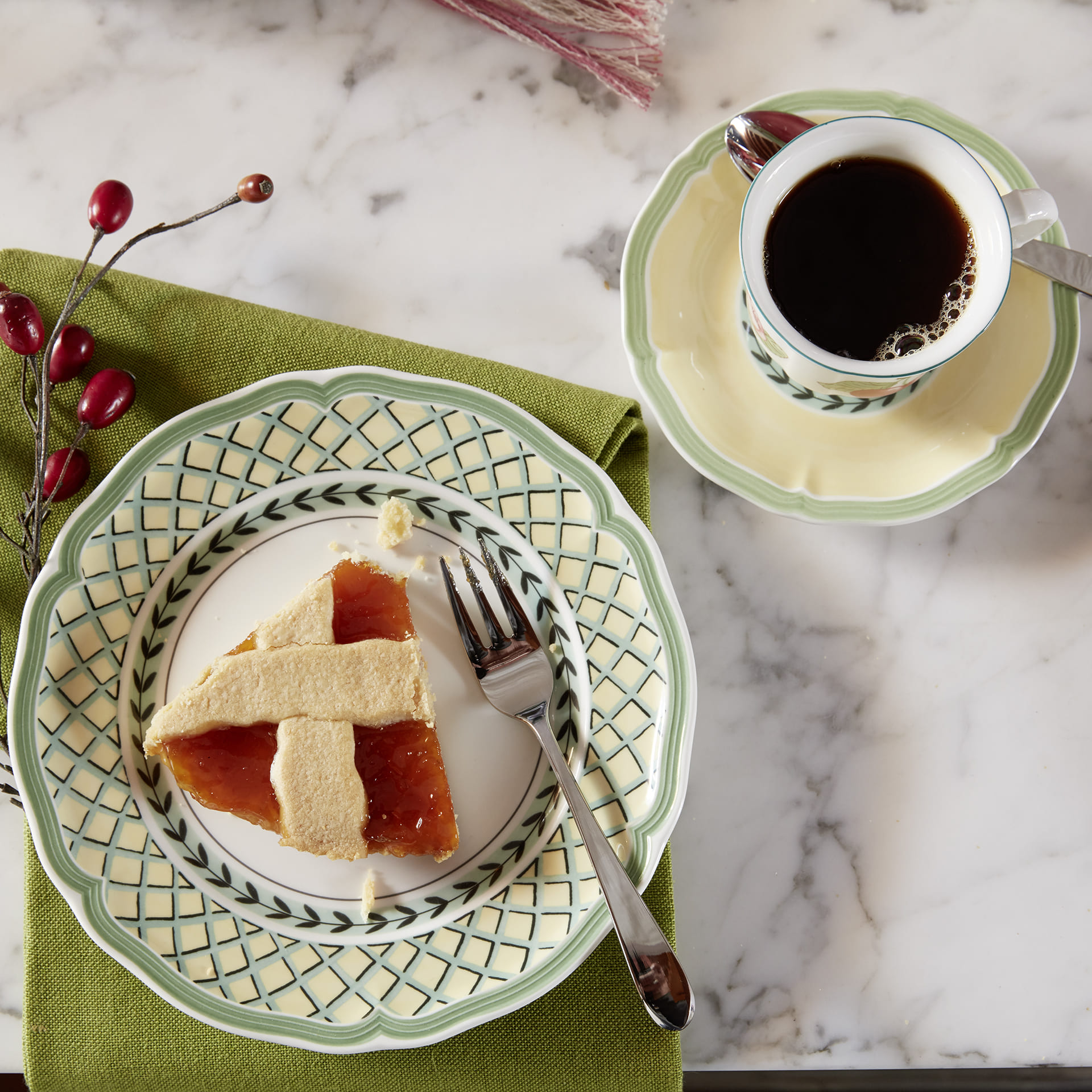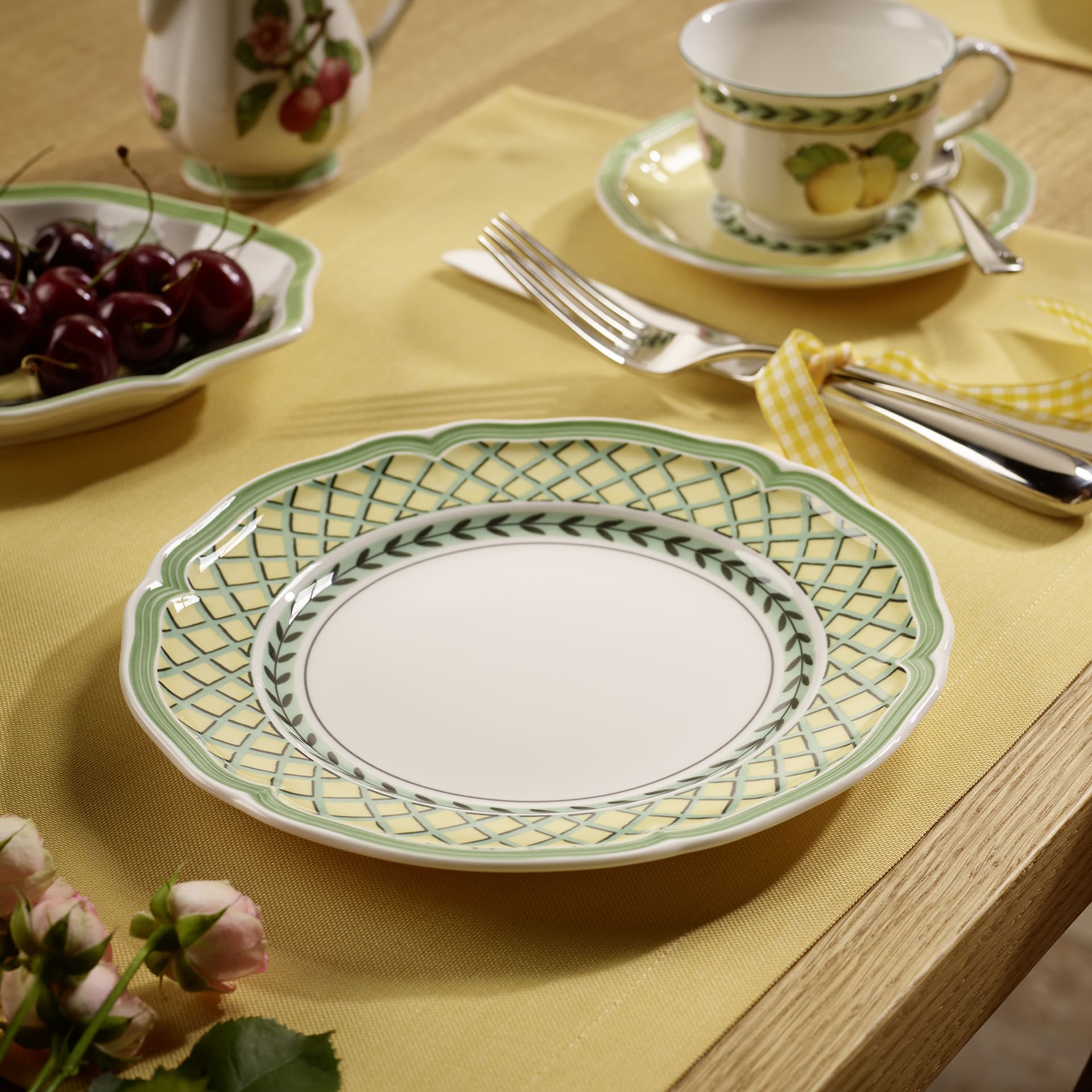 Salad plate for a perfect start to the day. French Garden creates a magnificent orchard on the table with traditional country house elements in warm colours. Its timeless beauty allows the different summer decors to be mixed and matched with each other. Warm croissants or fresh fruit: morning treats taste even better when served on this salad plate. Treat your loved ones to stylish tableware early in the morning.