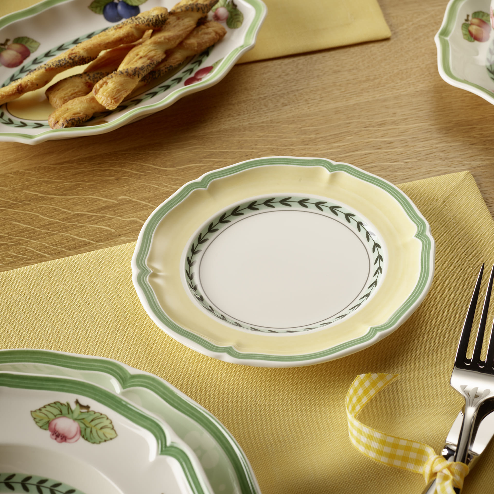 Bread plate for small side dishes. French Garden creates a magnificent orchard on the table with traditional country house elements in warm colours. Its timeless beauty allows the different summer decors to be mixed and matched with each other. Whether you prefer a strong farmhouse bread, original Italian ciabatta or oven-warm baguette: fresh bread is simply a part of any meal. Best served on the small plate matching the tableware. Impress your guests with beautiful details.