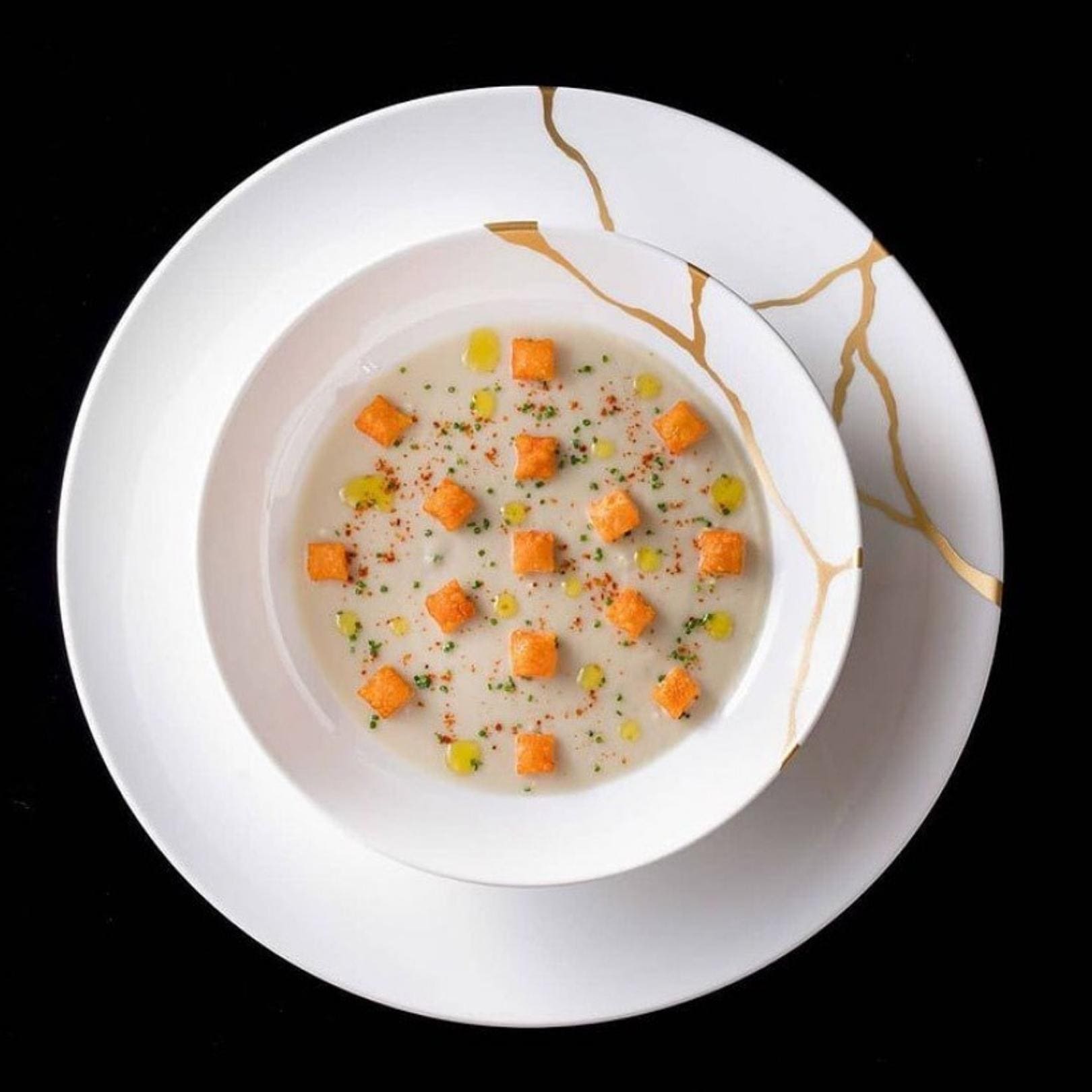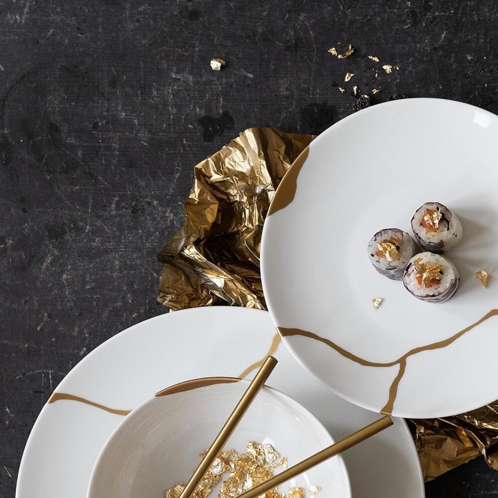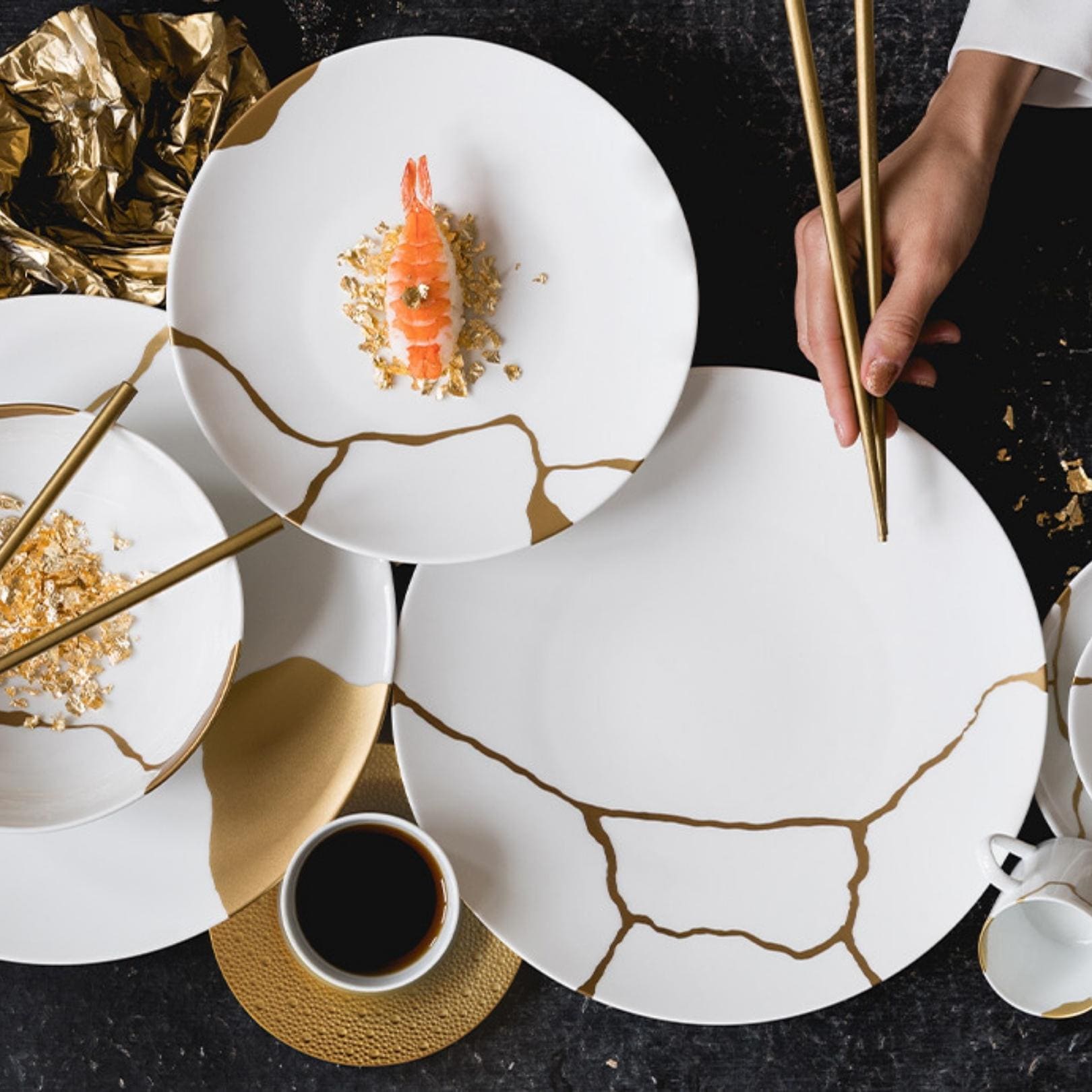 Inspired by the 16th century Japanese art, Kintsugi, a unique art form that makes visible repairs on ceramic, Bernardauds Kintsugi-Sarkis Dinnerware Collection mixes together lacquer and 24K gold for an opulent design that is both artistic and awe-inspiring.