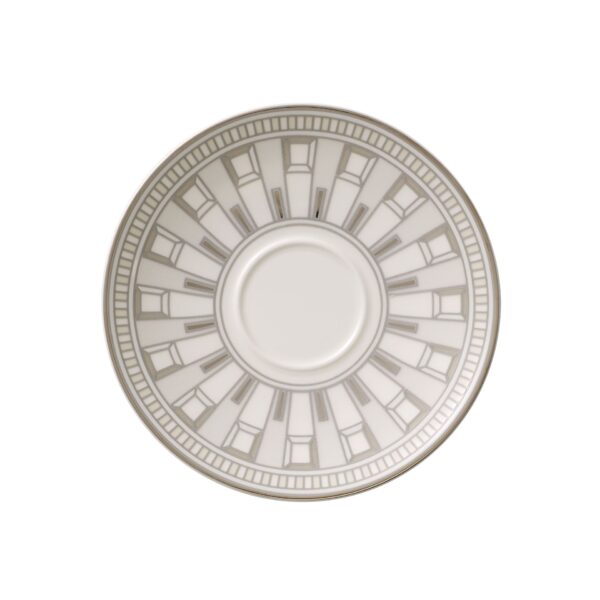 This saucer espresso cup forms part of la Classica Contura, the decorated option of the pure white collection la Classica Nuova. Inspired by domes and rotundas the Home decor underlines the clear design language of the tableware with fine lines and graphic patterns. It can be used alone but can also be wonderfully combined with the white version. To complete the table-settings a selection of matching accessories has been developed: glass candle stands in two different sizes with matching candles, and coordinating knife rests and napkin rings, also of glass.