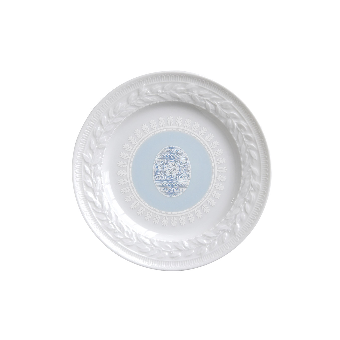 Blue salad plate from Louvre collection. The motifs engraved on the pieces that make up this white service create a stylish catalogue detailing the various periods of French architecture from the Renaissance through to the Second Empire which characterize this palace.