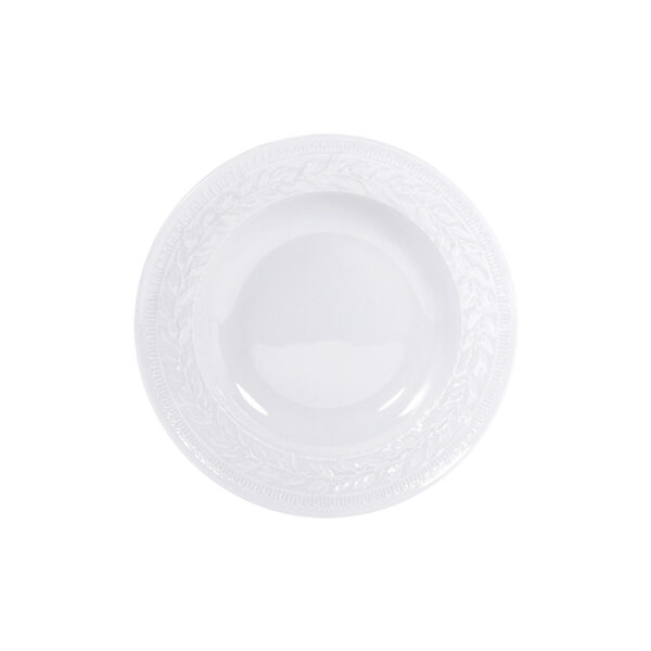 Large rim soup plate from Louvre collection. The motifs engraved on the pieces that make up this white service create a stylish catalogue detailing the various periods of French architecture from the Renaissance through to the Second Empire which characterize this palace.