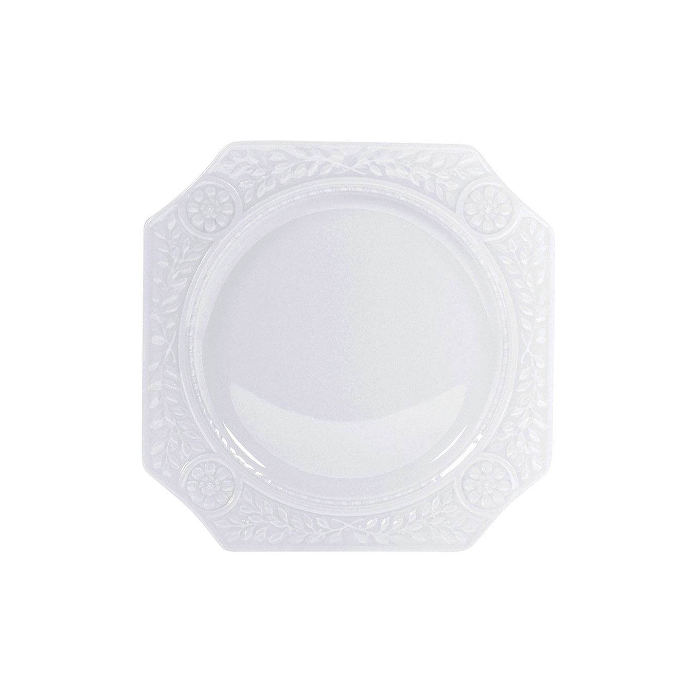 Square plate from Louvre collection. The motifs engraved on the pieces that make up this white service create a stylish catalogue detailing the various periods of French architecture from the Renaissance through to the Second Empire which characterize this palace.