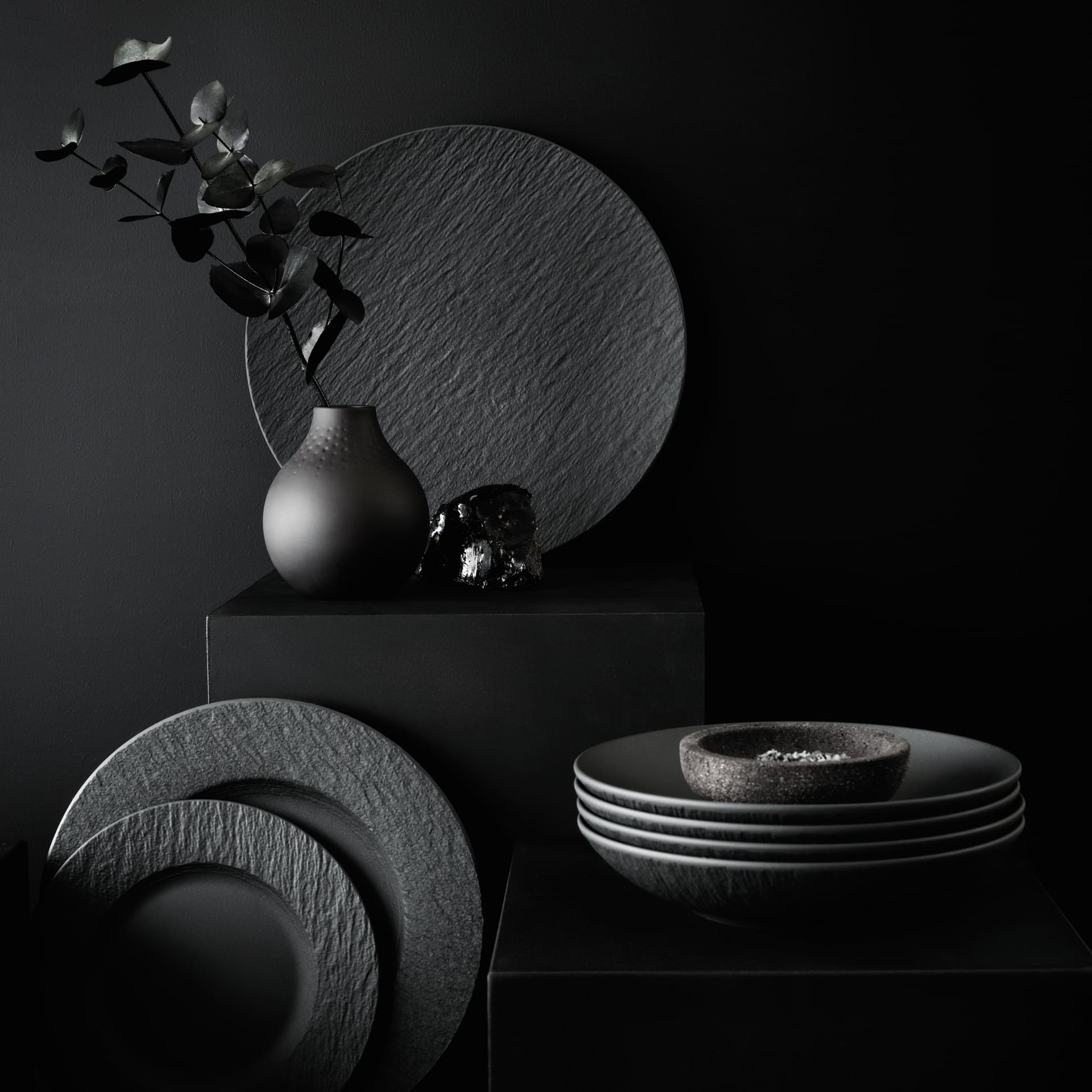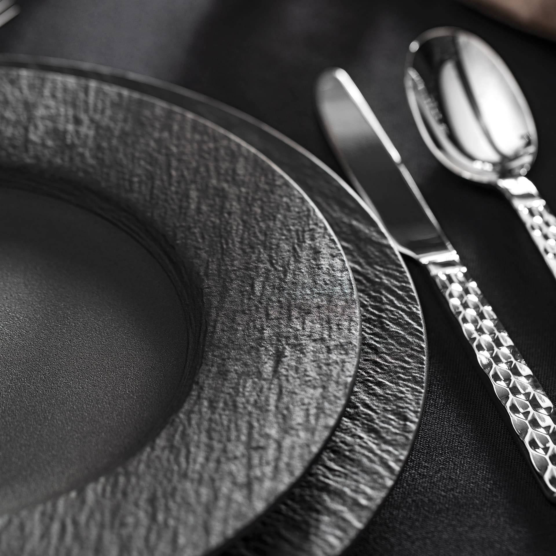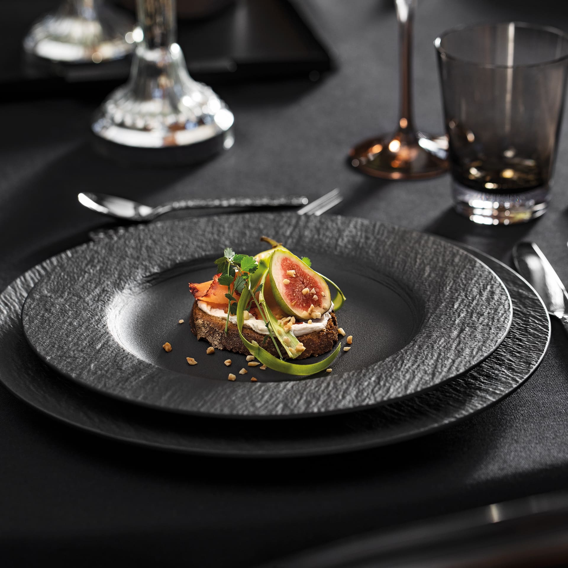 Original plate for lunch and dinner. Impress your guests with sophisticated tableware design. Natural, original and with a special feel: this is Manufacture Rock. The artisanal style in the form of matte slate-looking porcelain makes the collection truly unique. Combine it with the hand-painted pieces in the Manufacture sister collection to bring warmth to your table. This versatile black dinner plate from Manufacture Rock can also be used to serve fruit or pastries.