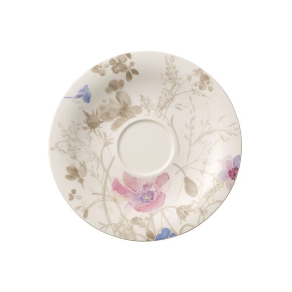 Saucer for a warm croissant with coffee at breakfast. The discreet colours of Mariefleur Gris flood your table with a sea of flowers in blue and grey. The elegantly curved shapes of the porcelain make preparing and serving your dishes twice as beautiful. This saucer perfectly complements the breakfast cup and is large enough for sweet treats. Enjoy a beautiful start to the day.