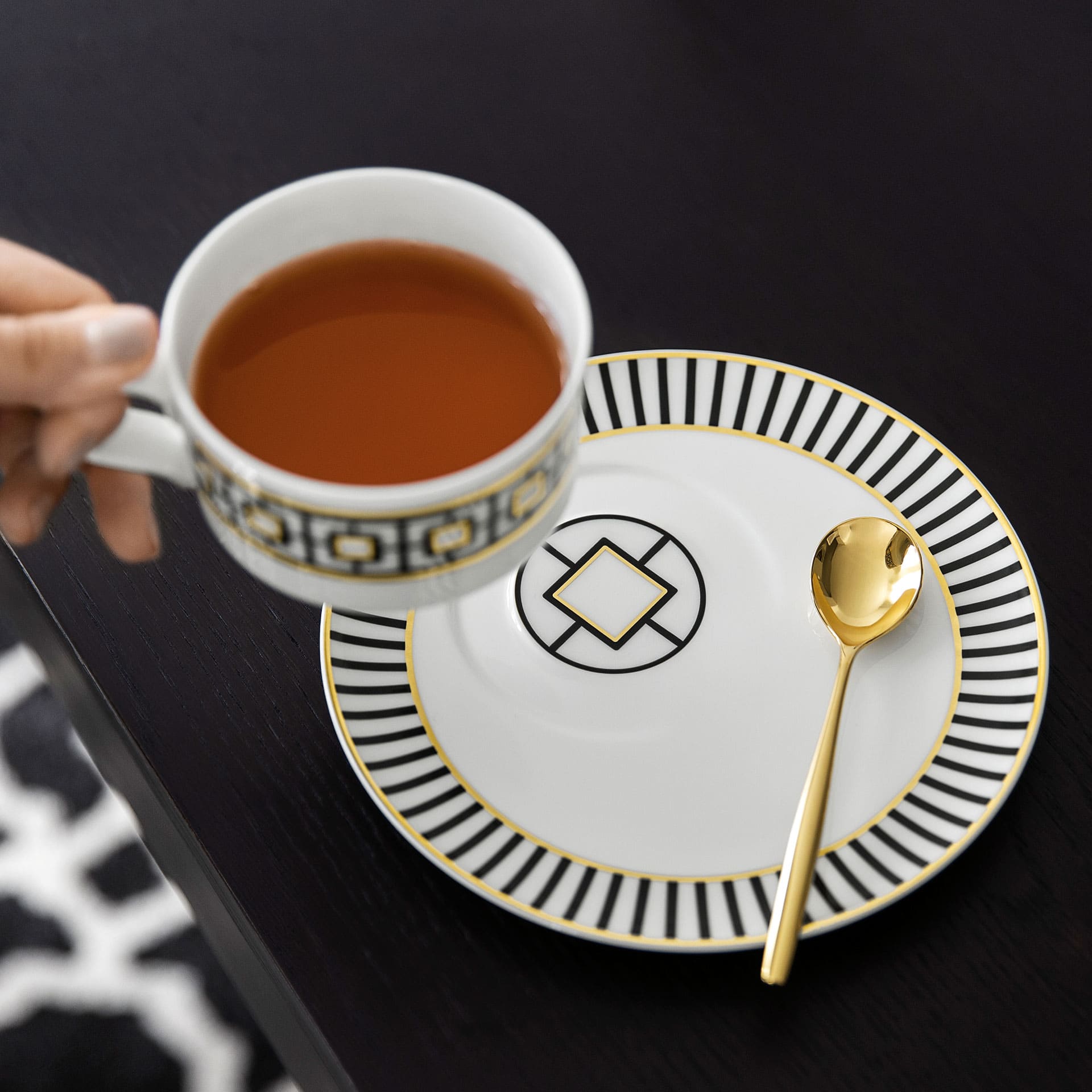 Whether a purist white or a geometric pattern in expressive black and gold – all pieces in the high-quality MetroChic tableware and gifts collection can be combined with each other in many different ways. The elegant and particularly resistant Premium Bone Porcelain transforms every table into a modern style statement of timeless elegance. This tea cup saucer with an offset cup rest will delight you for a long time with its brilliant pattern thanks to Inglaze Gold technology. Treat yourself to urban design and delight your guests.