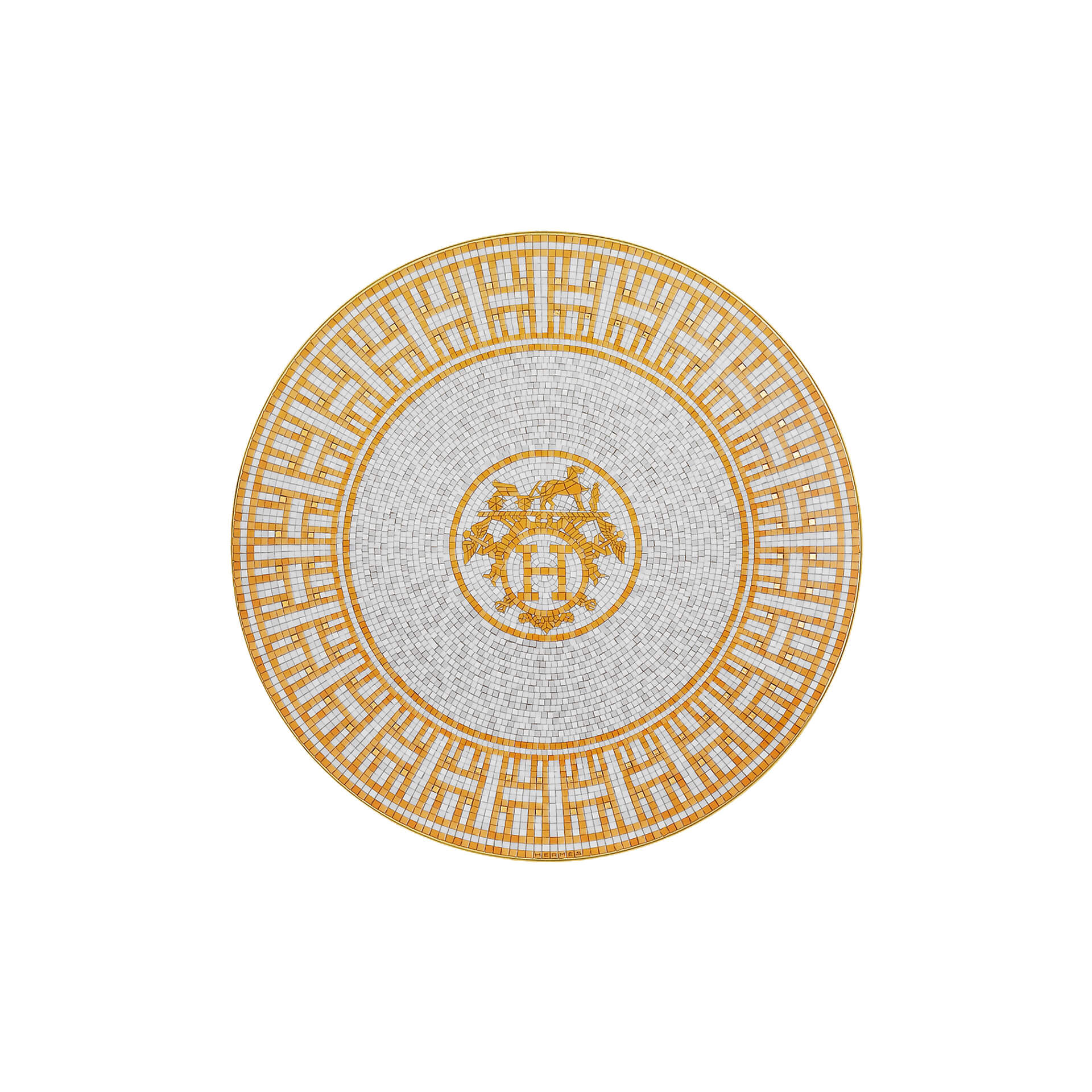 Dessert plate from Mosaïque au 24 collection. Tiny ochre and pale grey squares interspersed with gold tiles create geometrical patterns that blend the Art Deco and ancient Greek styles. In the center, a monogrammed H or Hermès ex-libris complete the design inspired by the Parisian store at 24, rue du Faubourg Saint-Honoré.