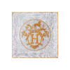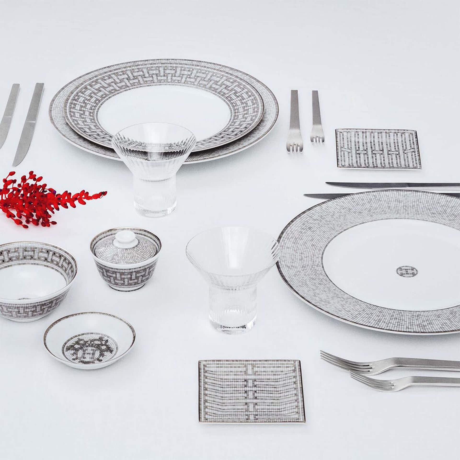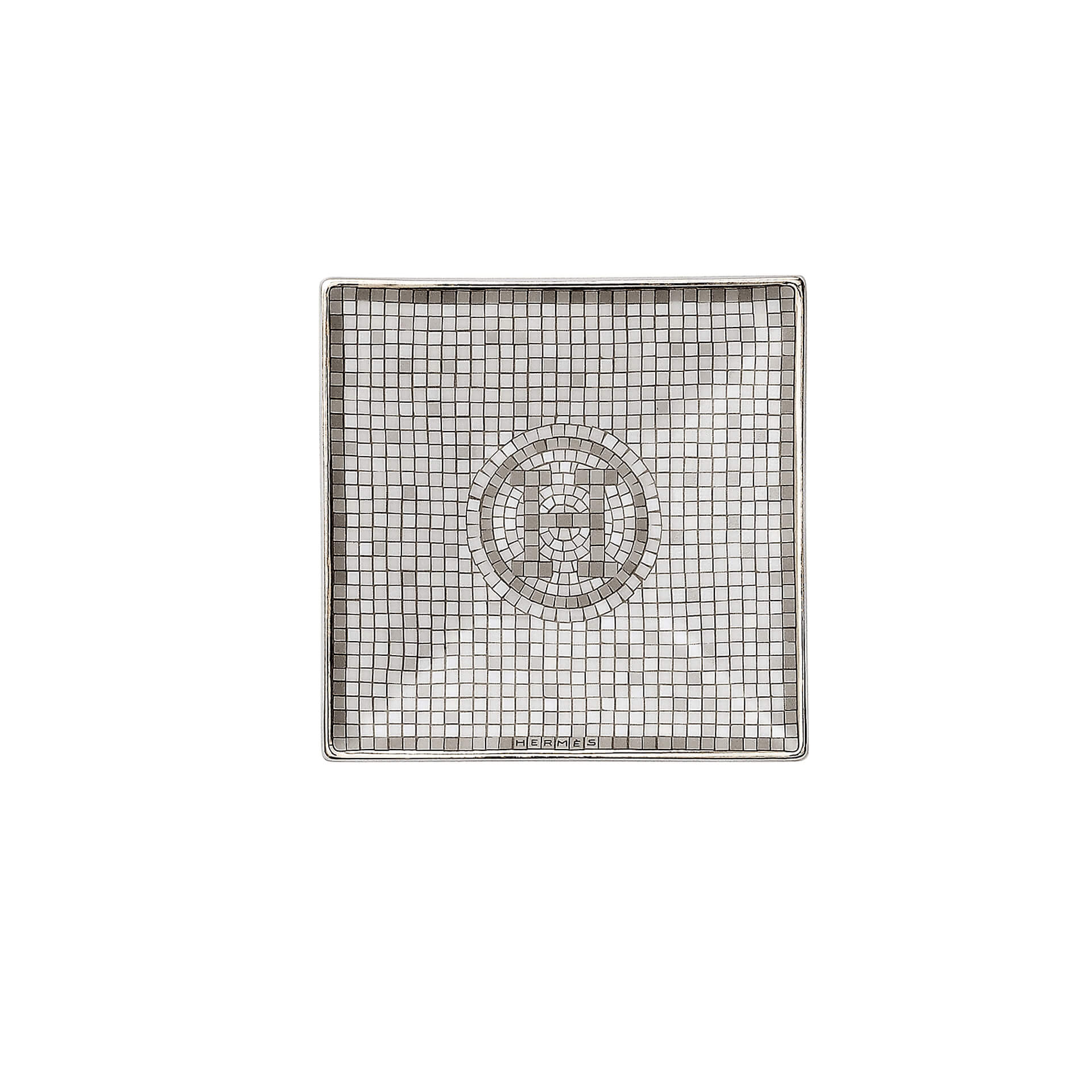 Square plate № 1 from Mosaïque au 24 collection. Tiny ochre and pale grey squares interspersed with gold tiles create geometrical patterns that blend the Art Deco and ancient Greek styles. In the center, a monogrammed H or Hermès ex-libris complete the design inspired by the Parisian store at 24, rue du Faubourg Saint-Honoré.