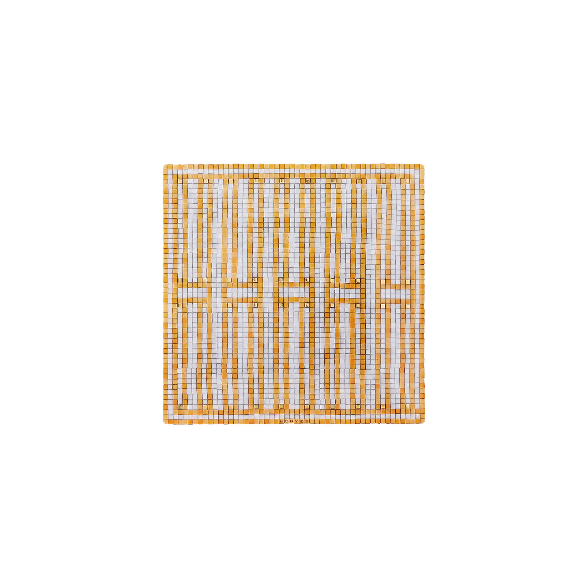 Square plate № 2 from Mosaïque au 24 collection. Tiny ochre and pale grey squares interspersed with gold tiles create geometrical patterns that blend the Art Deco and ancient Greek styles. In the center, a monogrammed H or Hermès ex-libris complete the design inspired by the Parisian store at 24, rue du Faubourg Saint-Honoré.