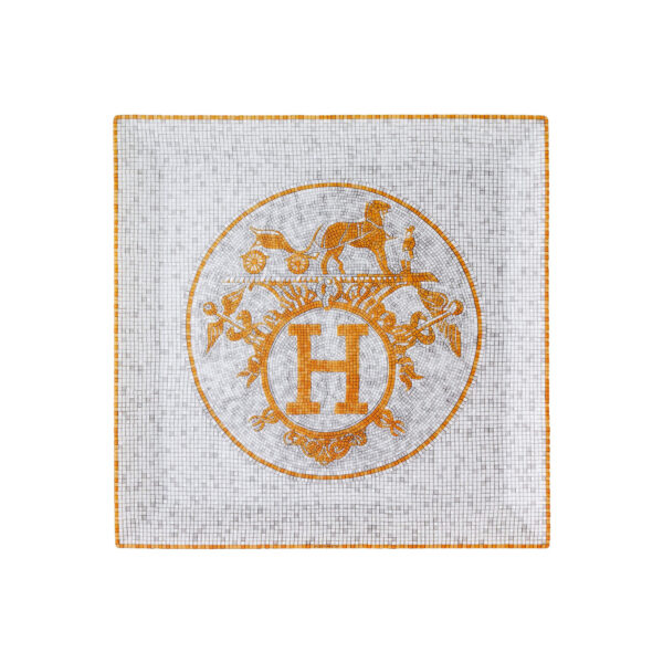 Square plate № 5 from Mosaïque au 24 collection. Tiny ochre and pale grey squares interspersed with gold tiles create geometrical patterns that blend the Art Deco and ancient Greek styles. In the center, a monogrammed H or Hermès ex-libris complete the design inspired by the Parisian store at 24, rue du Faubourg Saint-Honoré.