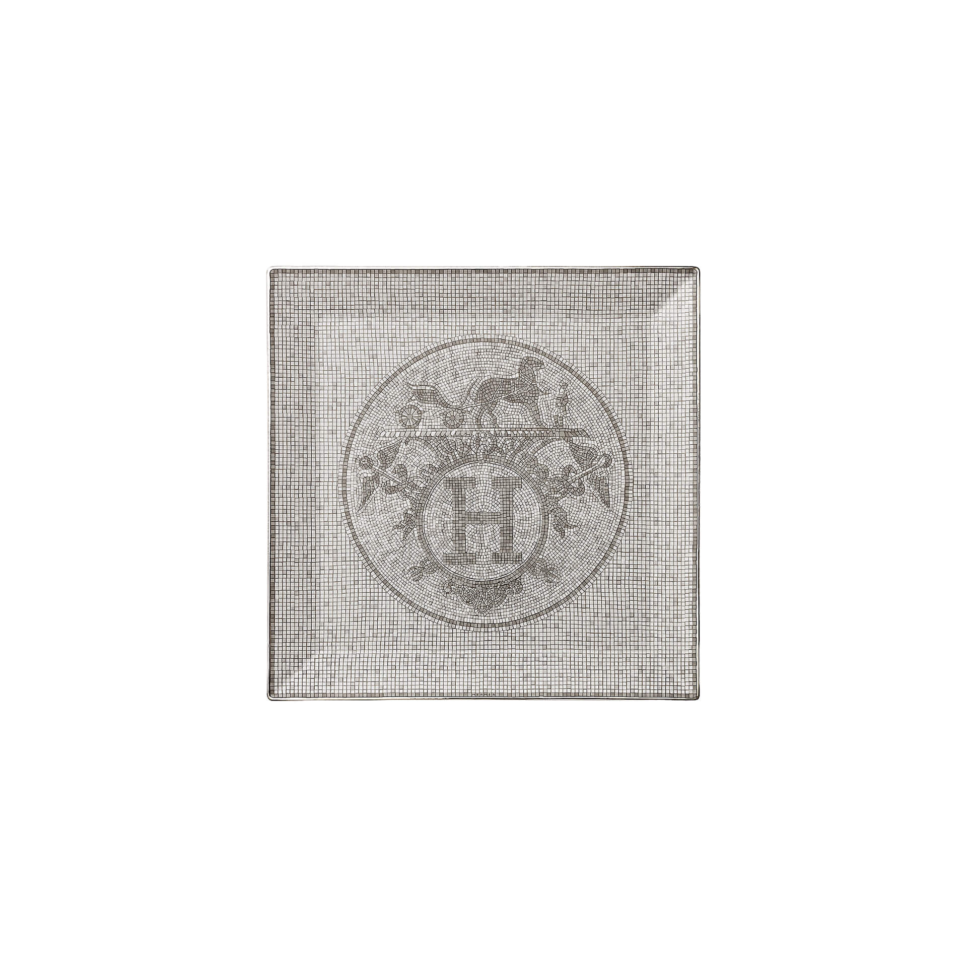 Square plate № 5 from Mosaïque au 24 collection. Tiny ochre and pale grey squares interspersed with gold tiles create geometrical patterns that blend the Art Deco and ancient Greek styles. In the center, a monogrammed H or Hermès ex-libris complete the design inspired by the Parisian store at 24, rue du Faubourg Saint-Honoré.