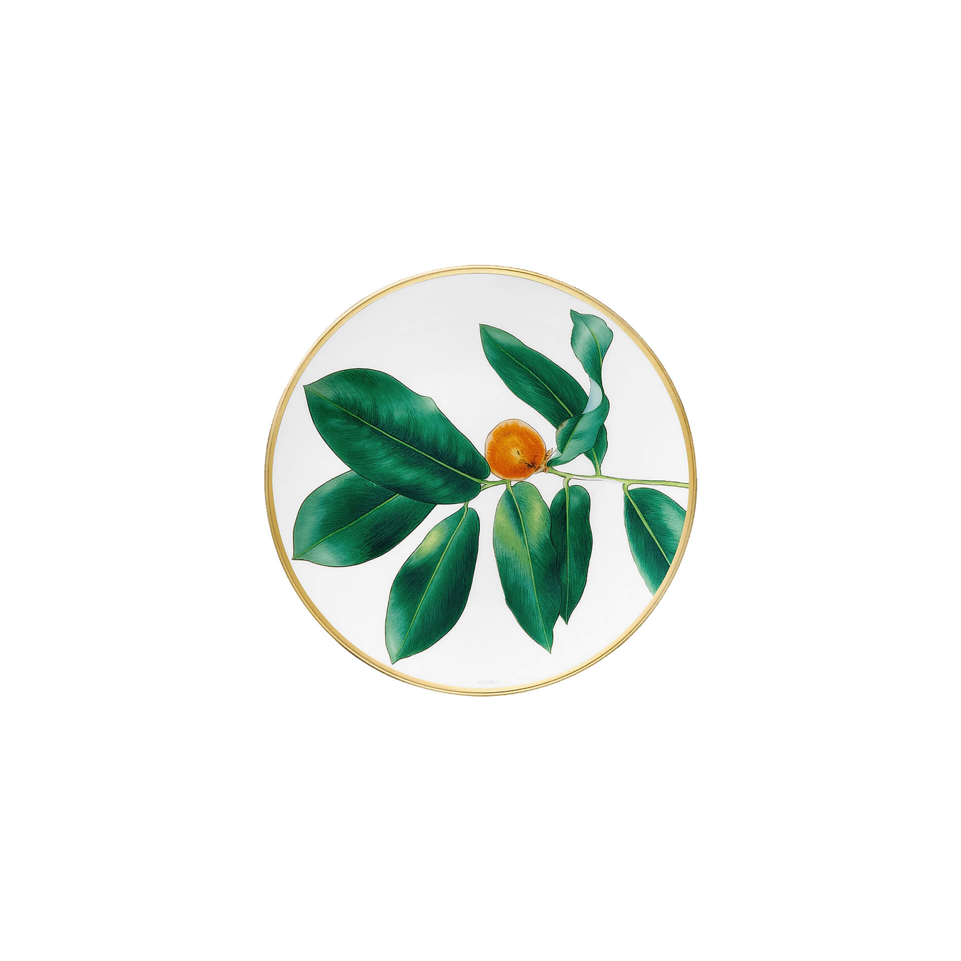 Bread and butter plate kalos from Passifolia collection. Nathalie Rolland-Huckel designed Passifolia, the tableware collection by Hermès, between two worlds, at the threshold between botanical tradition and art. Drawn from nature, her designs reveal delicate authenticity. From the side plates to the presentation platters, the coffee cups to the dinner plates, the thirty pieces that make up the Passifolia tableware collection are the fruit of an artisanal adventure, an exploration of know-how by the house of Hermès. New techniques and a series of skills were developed to faithfully reproduce the artist’s lush tropical palette and the delicacy of her line.