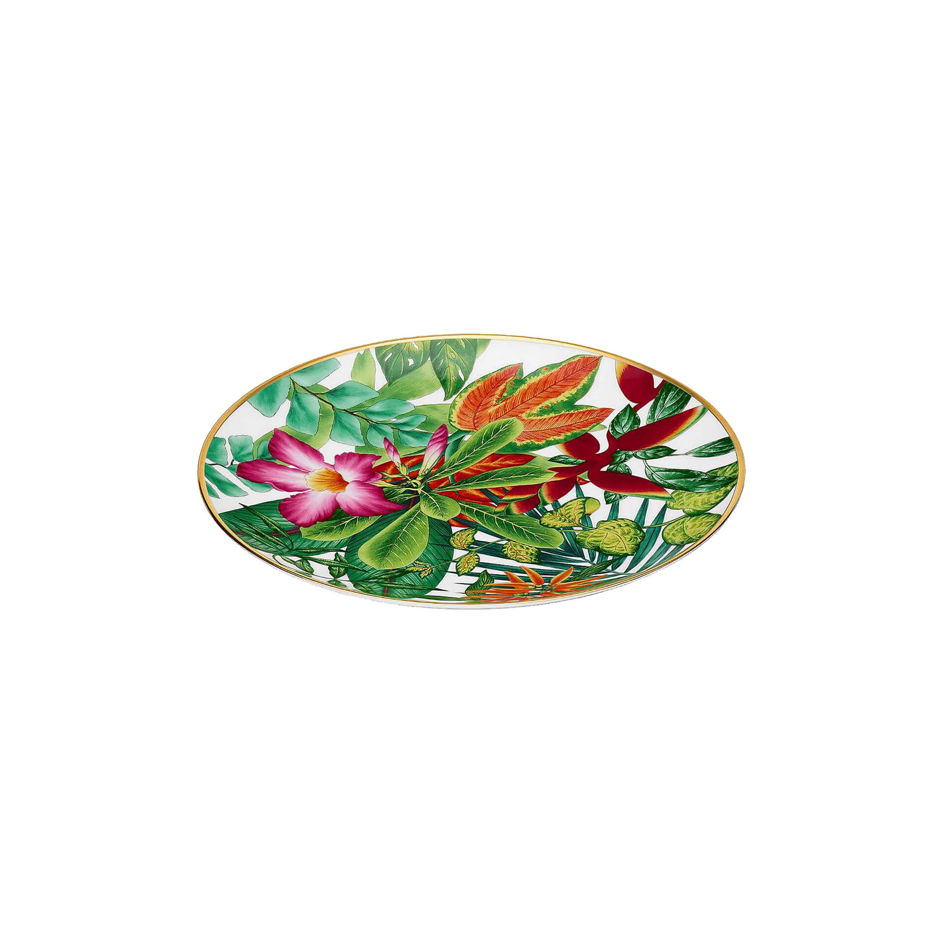 Dessert plate desert rose from Passifolia collection. Nathalie Rolland-Huckel designed Passifolia, the tableware collection by Hermès, between two worlds, at the threshold between botanical tradition and art. Drawn from nature, her designs reveal delicate authenticity. From the side plates to the presentation platters, the coffee cups to the dinner plates, the thirty pieces that make up the Passifolia tableware collection are the fruit of an artisanal adventure, an exploration of know-how by the house of Hermès. New techniques and a series of skills were developed to faithfully reproduce the artist’s lush tropical palette and the delicacy of her line.