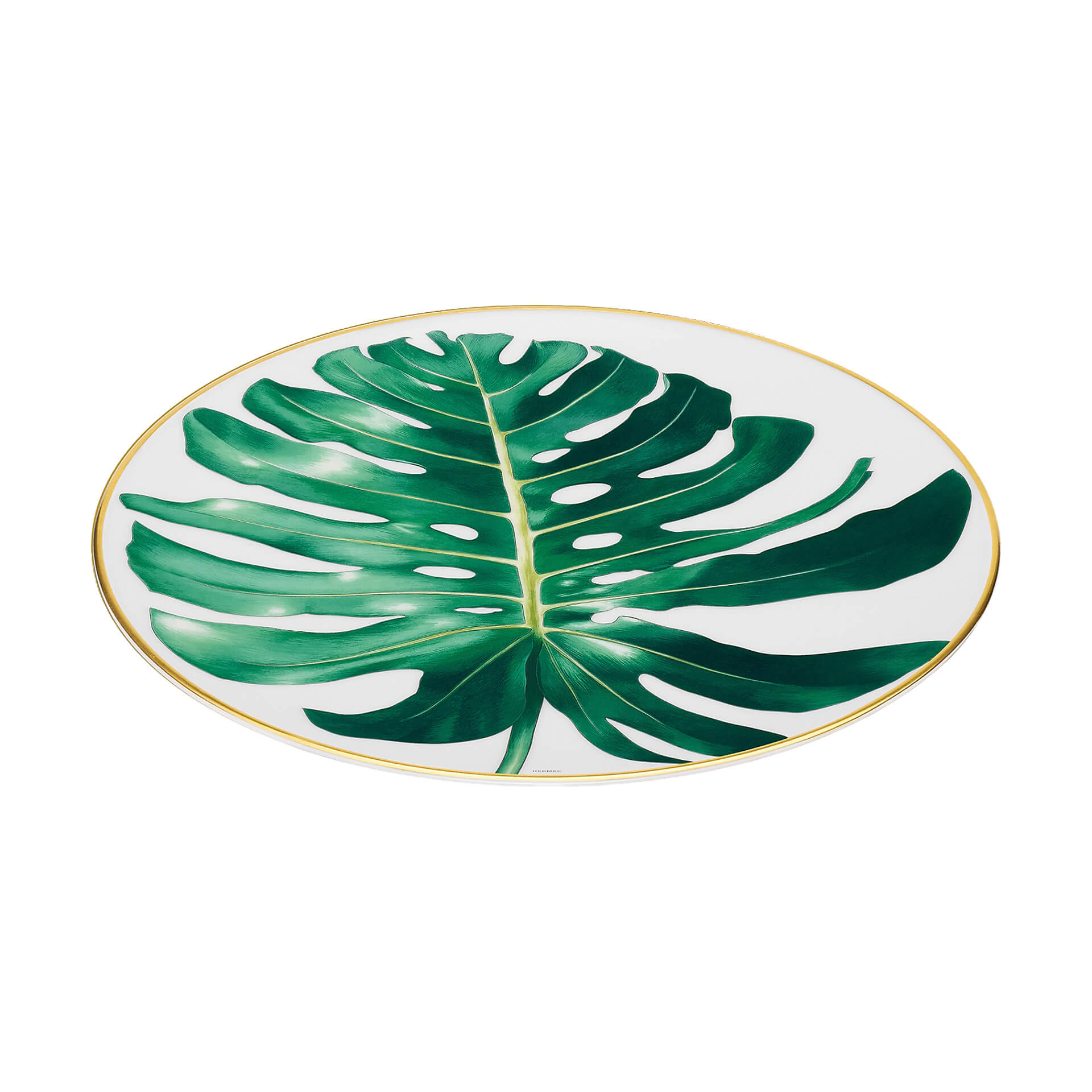 DInner plate palm from Passifolia collection. Nathalie Rolland-Huckel designed Passifolia, the tableware collection by Hermès, between two worlds, at the threshold between botanical tradition and art. Drawn from nature, her designs reveal delicate authenticity. From the side plates to the presentation platters, the coffee cups to the dinner plates, the thirty pieces that make up the Passifolia tableware collection are the fruit of an artisanal adventure, an exploration of know-how by the house of Hermès. New techniques and a series of skills were developed to faithfully reproduce the artist’s lush tropical palette and the delicacy of her line.