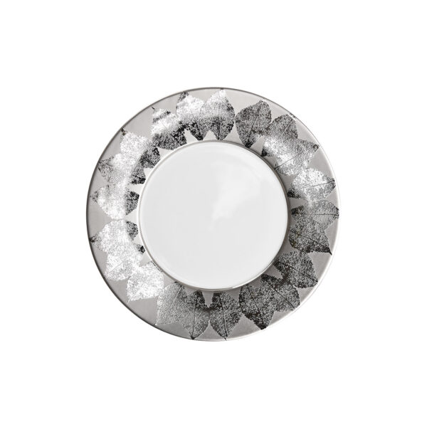 Platinum salad plate from Silva collection. The name of this new pattern comes from the Latinum “silva”, a poetical evocation of trees, masters of the forest. It also invites us to look closer and admire the beauty of Nature: delicate leaf veins and lace-like plant fibers ornate the rim of plates, alternatively in white on white or platinum relief.