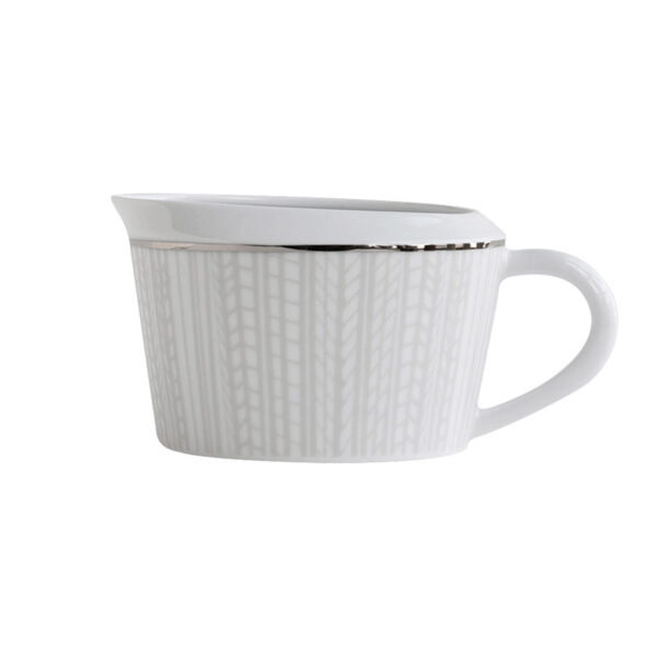 Gravy boat from Silva collection. The name of this new pattern comes from the Latinum “silva”, a poetical evocation of trees, masters of the forest. It also invites us to look closer and admire the beauty of Nature: delicate leaf veins and lace-like plant fibers ornate the rim of plates, alternatively in white on white or platinum relief.