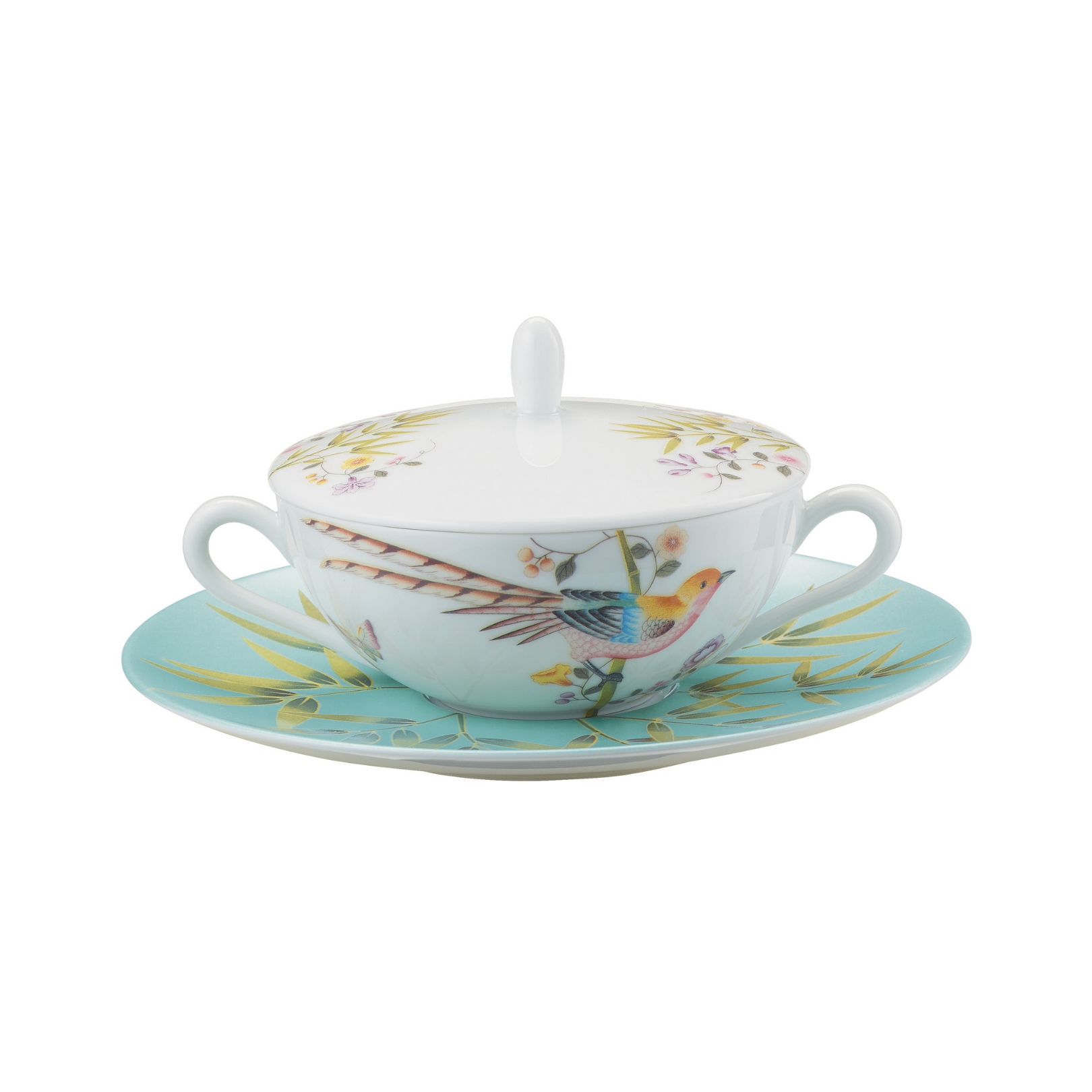 Porcelaines Raynaud has created a magical collection with an enchanting décor designed in collaboration with Fromental, a well-known name in British interior design. Inspiration for this pattern was drawn from Fromental’s Chinoiserie wallpaper collection, which represents the exoticism and luxuriance of nature overflowing with butterflies and birds of paradise. This vision of a welcoming and untouched natural world leads us on a dreamlike journey. Raynaud brings a modern twist to wallpaper patterns transferred to streamlined shapes, with the focus on patterns and the way they are centred varying according to the piece. The main pieces are available in turquoise, with a multicoloured pattern enhanced by a metallic coloured background echoing the woven effect of wallpaper. In line with Cristobal and Verdures patterns, “Paradis” is now writing a new chapter in the story which links Raynaud with decorators.