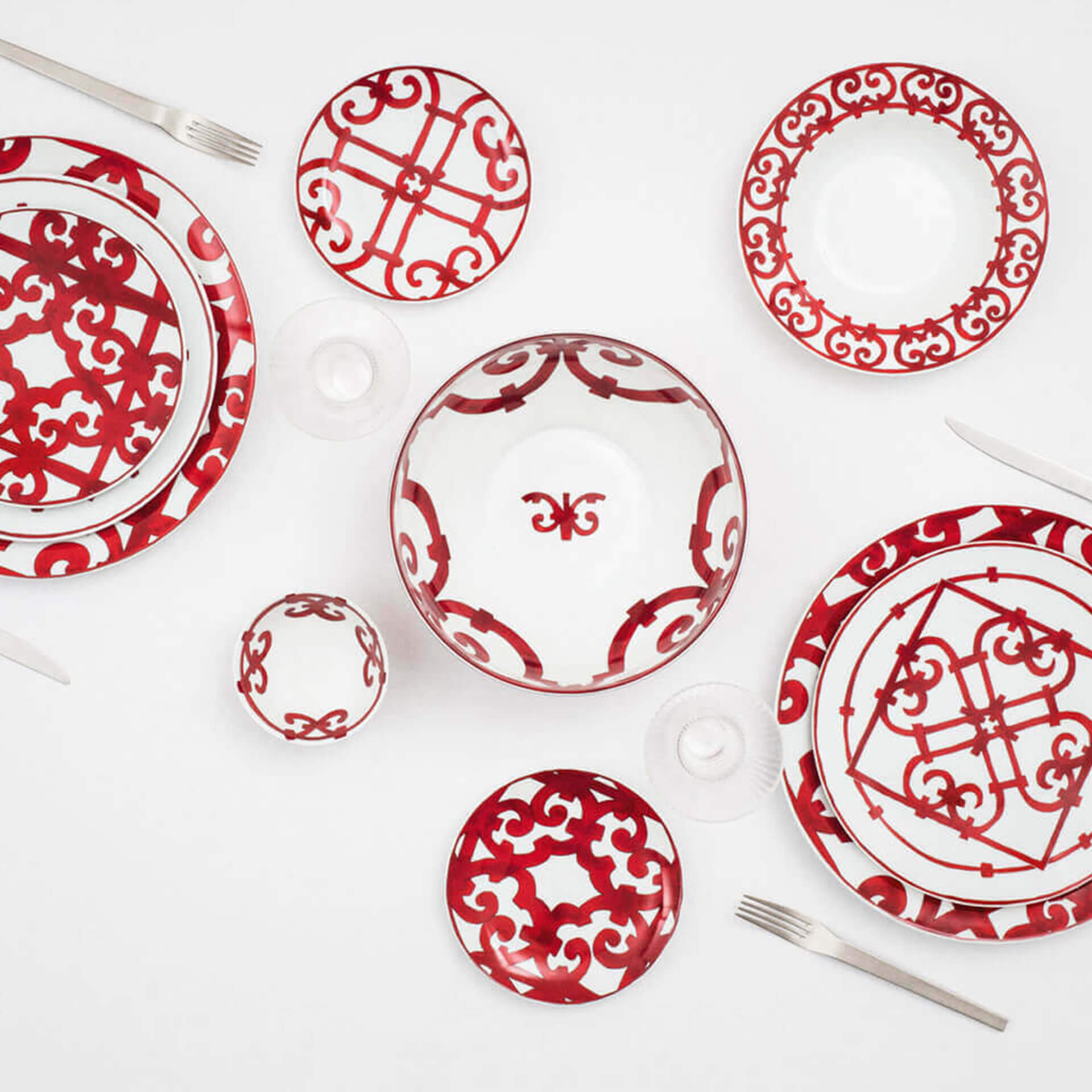 Sugar bowl from Balcon du Guadalquivir collection. The graphic, bold scenery recalls the ironwork of Andalusian towns. The sturdiness of the drawing, the vitality of the colour red, and the wealth and variety of the pieces make it a noble table service.