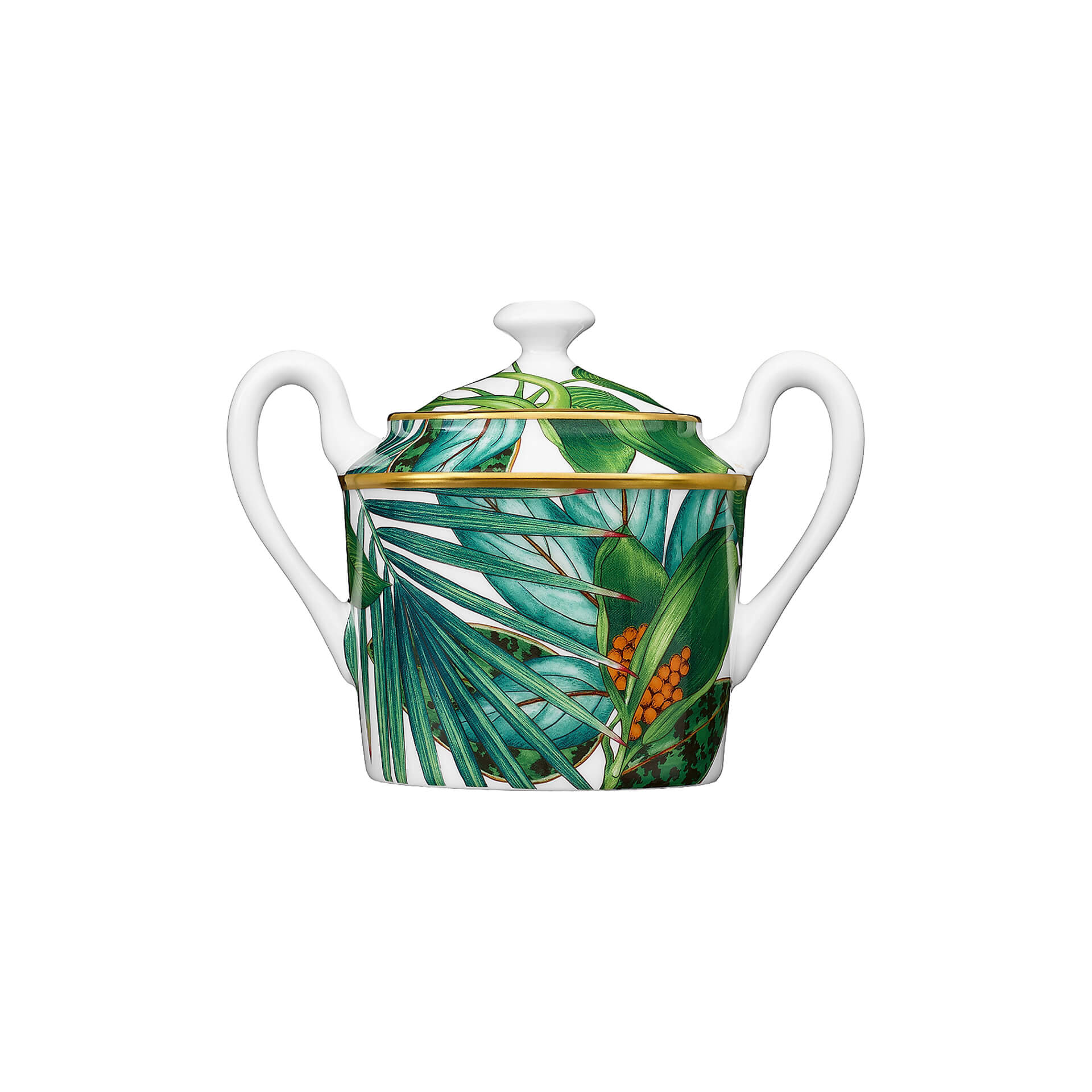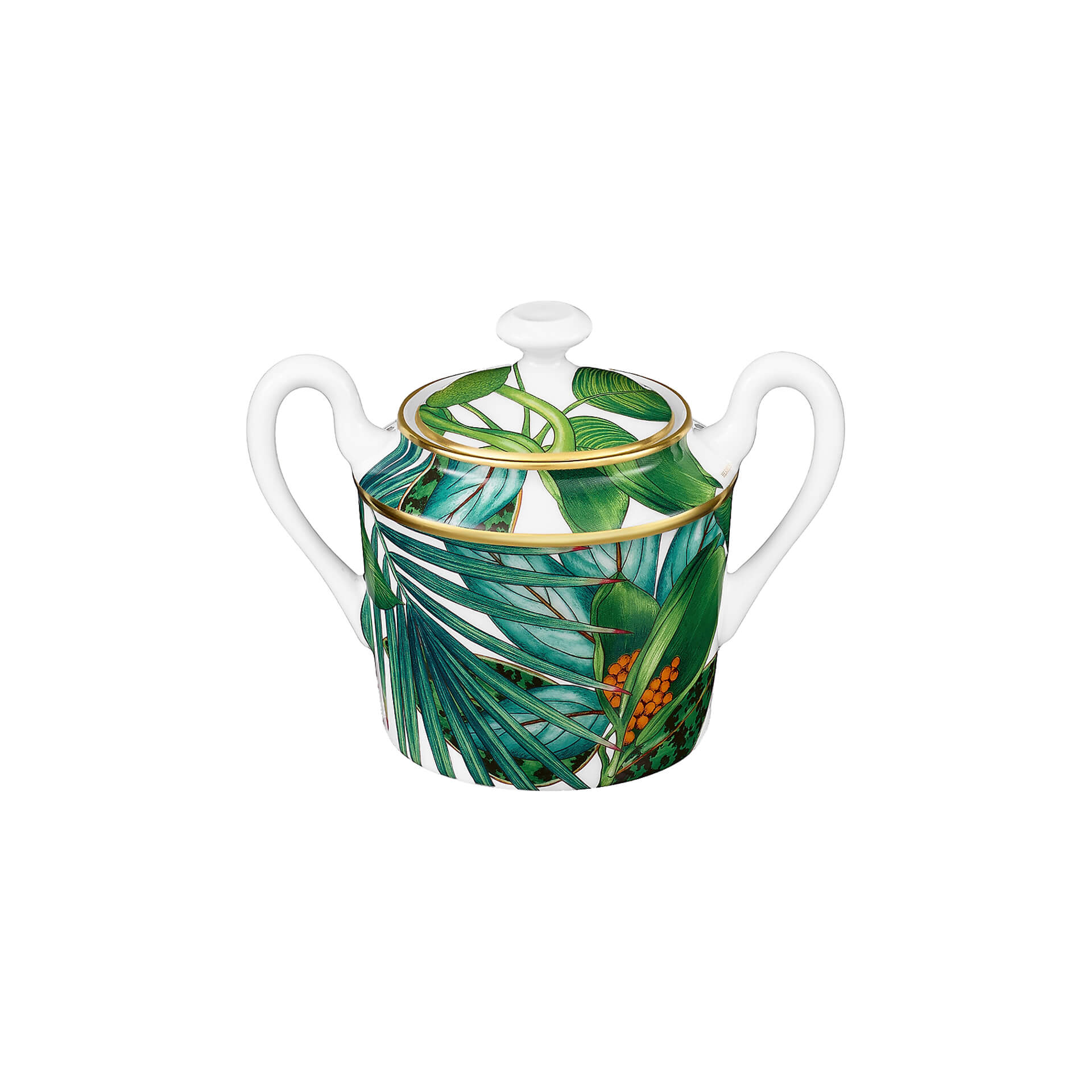 Sugar bowl from Passifolia collection. Nathalie Rolland-Huckel designed Passifolia, the tableware collection by Hermès, between two worlds, at the threshold between botanical tradition and art. Drawn from nature, her designs reveal delicate authenticity. From the side plates to the presentation platters, the coffee cups to the dinner plates, the thirty pieces that make up the Passifolia tableware collection are the fruit of an artisanal adventure, an exploration of know-how by the house of Hermès. New techniques and a series of skills were developed to faithfully reproduce the artist’s lush tropical palette and the delicacy of her line.