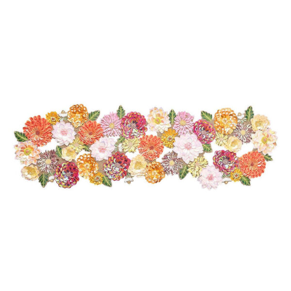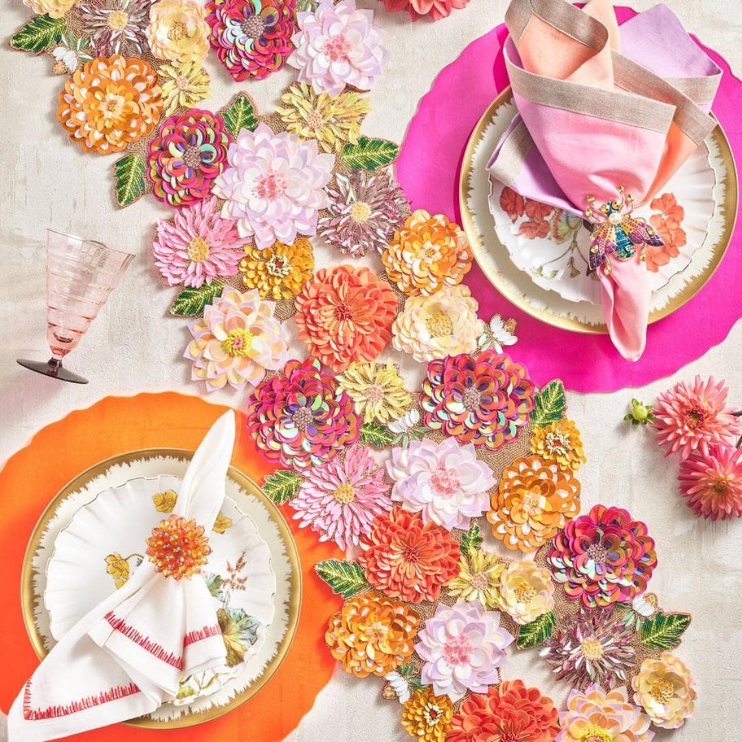 Named for the summer-blooming flower that signifies elegance and strength, the exquisite Dahlia Runner radiates magnificence. Over 35 sequins and beads in vibrant pink, orange and amethyst colors are hand-layered and folded to create the three-dimensional Dahlia Runner.