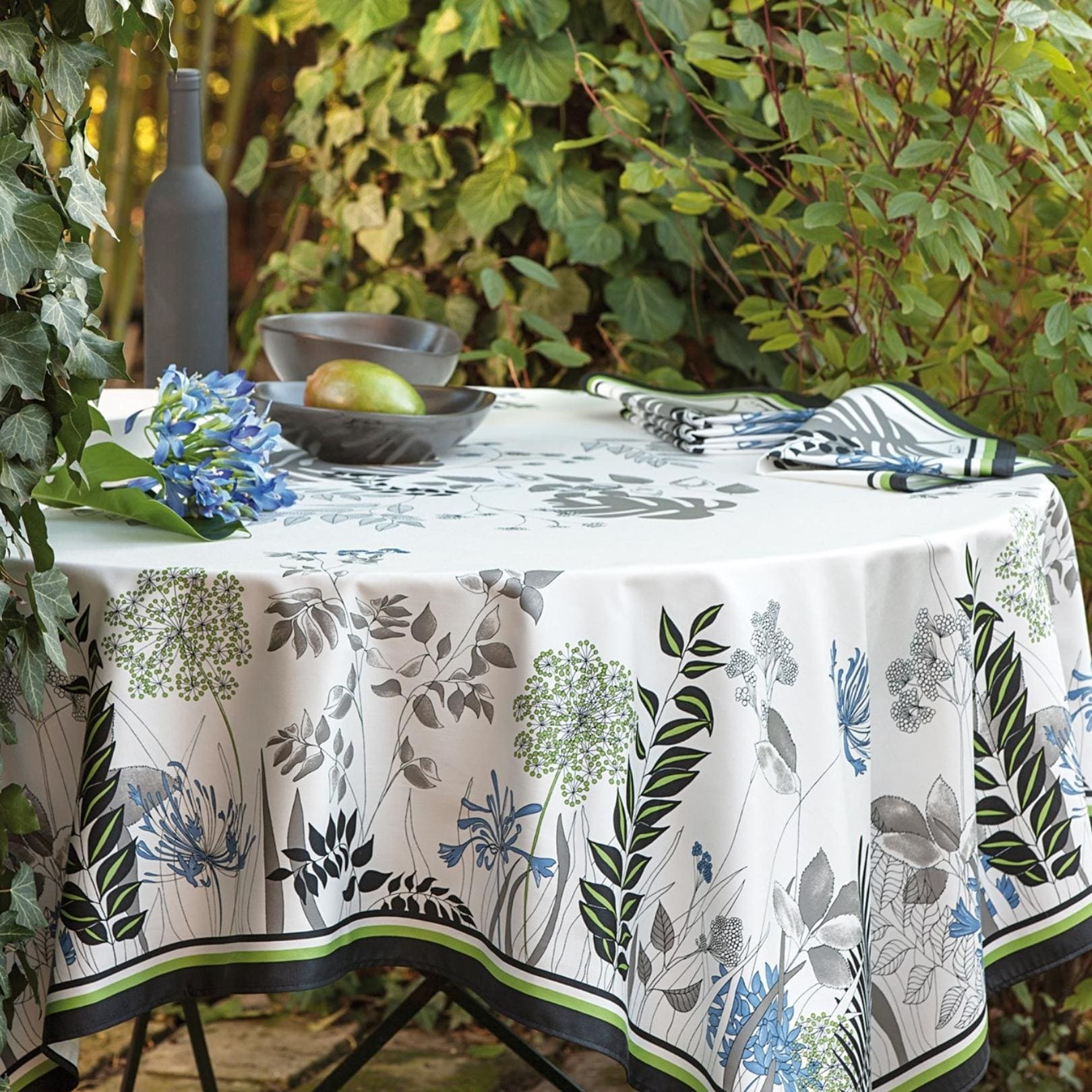 The Agapanthes tablecloth reveals a lush nature at the table. Inspired by a flora and foliage abundant with details, the patterns of this pretty tablecloth bring freshness and serenity to your interior decoration.