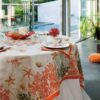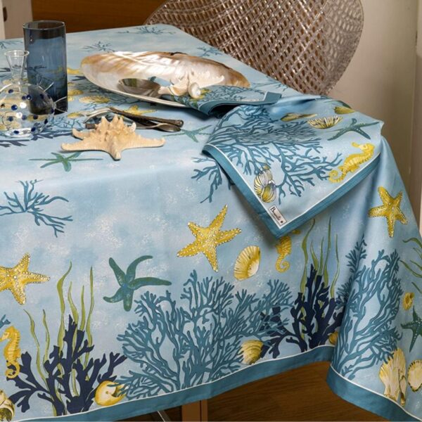 Treat yourself to an exotic trip to the seaside with the Corail tablecloth. A seascape adorned with corals and shells is subtly revealed on this model of stain resistant tablecloth. With its coral and blue colors, this beautiful tablecloth makes you discover the richness of the ocean depths.