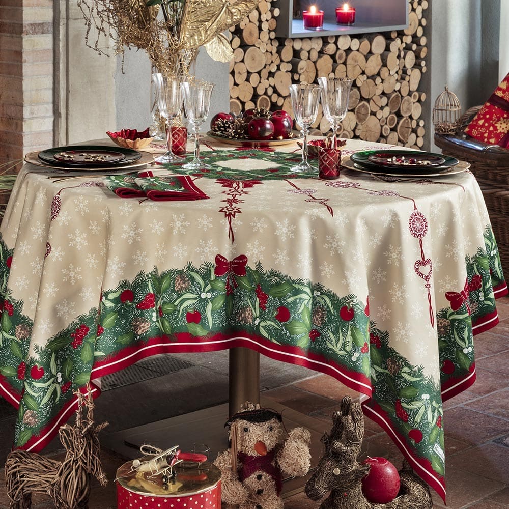The Jour de fête tablecloth invites you to renew with tradition and to gather parents and children around an exceptional meal. A symbol of the holidays par excellence, this pretty tablecloth reveals a design created with finesse and passion to recreate the magical world of Christmas.