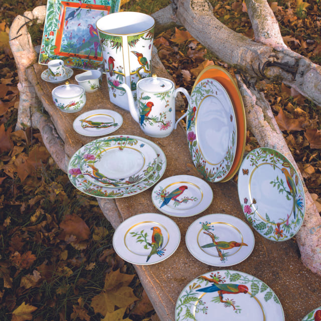 Alain Thomas Teapot. The Alain Thomas dinner service from Haviland is brightly decorated with parrots, butterflies, plants and orchids. French artist Alain Thomas painted this tropical world. With its rich choice of motifs and intensive colours, the high-quality Alain Thomas dinner service from Haviland is a masterpiece, on which there is always something new to discover. It recounts a story – only not, as is usual, on paper, but on high-quality Limoges porcelain.