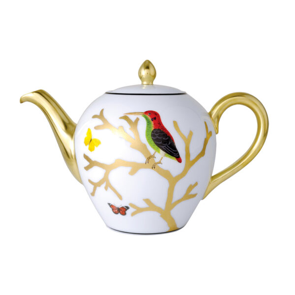 Teapot 12 cups from Aux Oiseaux collection. Inspired by the curiosity cabinets that were so fashionable in the 16th and 17th centuries, the pattern is available on a full dinnerware service with scenes reminiscent of japanese prints: birds depicted in automnal colors perch on stylised trees in raised gold.