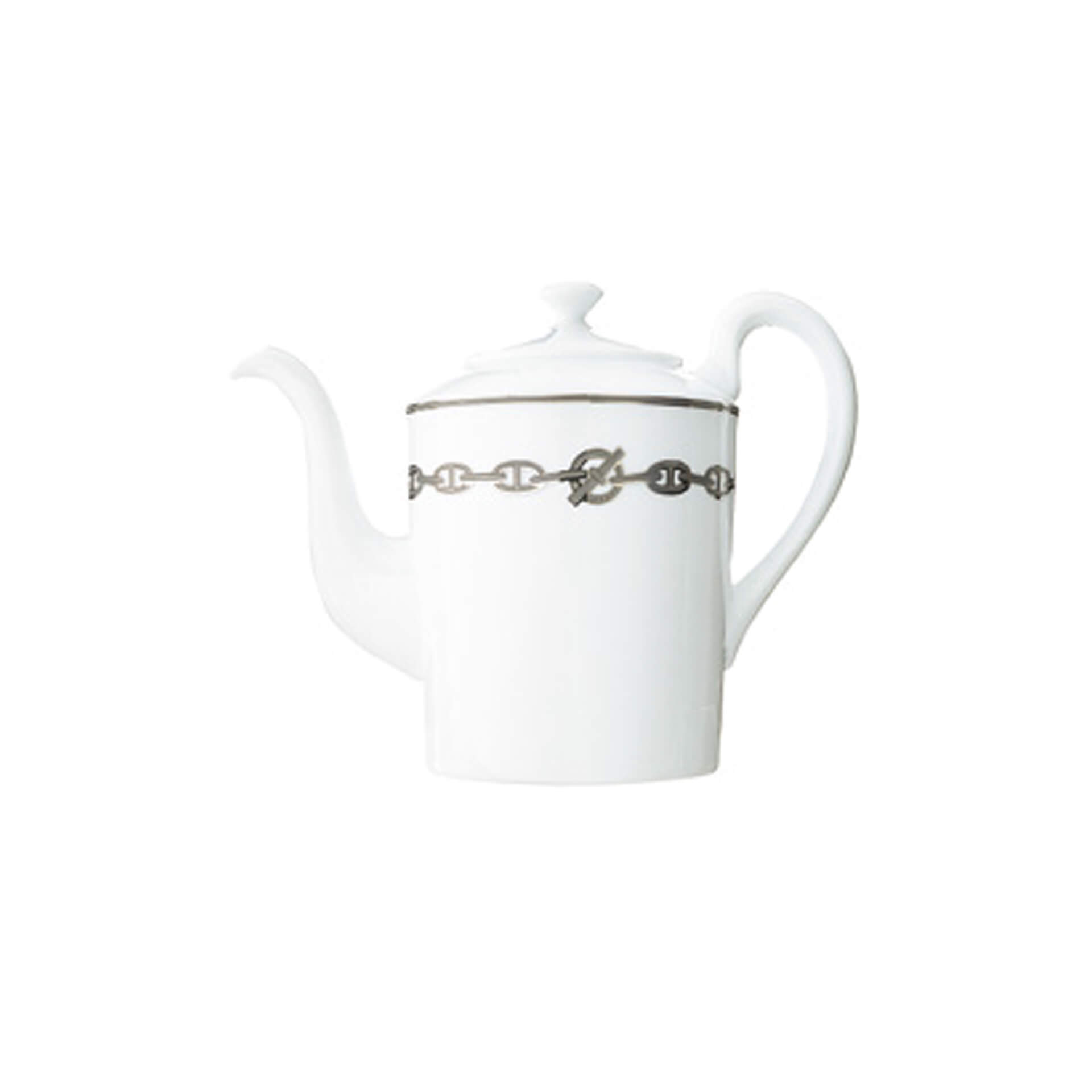 Teapot from Chaîne d’Ancre Platine collection. The Chaîne d’Ancre Platine pattern brings the nautical world to the table. The subdued chain-link motif adorns the service dishes and circles the rim of the plates.