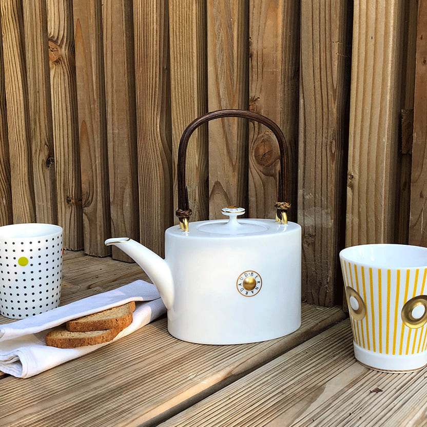Shanghaï Olivier Gagnère teapot Platinum. Coordinated with the cups, it allows to brew and serve tea while keeping it hot. Olivier Gagnère is one of the designers who has been working with Bernardaud for many years. In 1993, he created a unique cup whose singularity is to match all tables and uses. Since then, his creations punctuate the history of the manufacture, such as the goblet, which he rehabilitates on the table, the vase that he reinvents in refined forms or the chandelier to which he offers the translucency of porcelain.